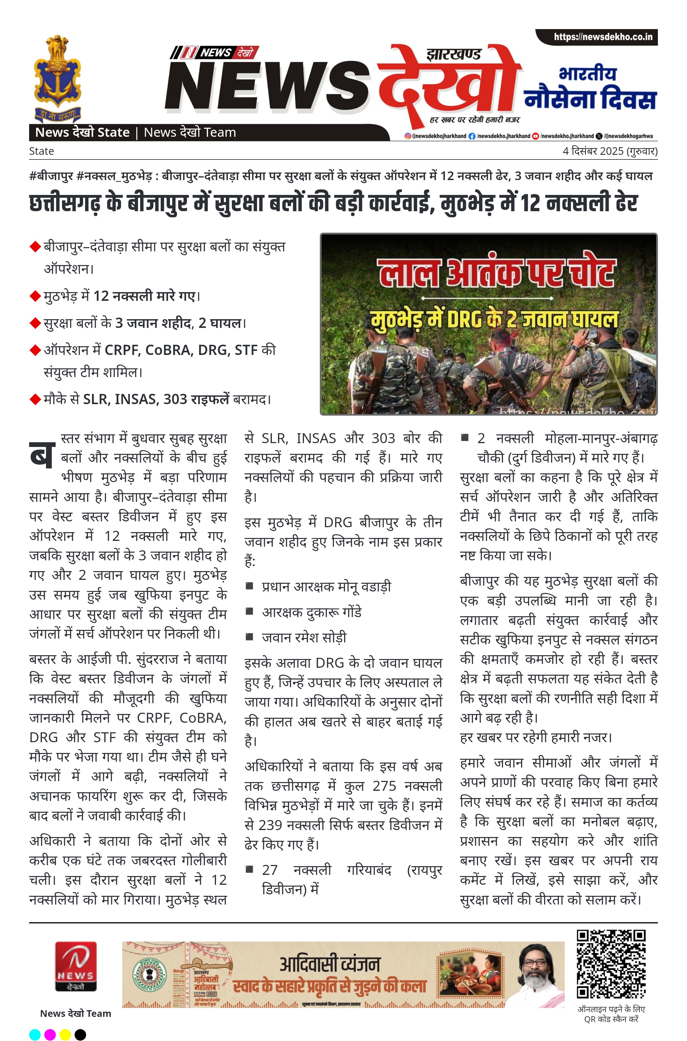 #बीजापुर #नक्सल_मुठभेड़ : बीजापुर–दंतेवाड़ा सीमा पर सुरक्षा बलों के संयुक्त ऑपरेशन में 12 नक्सली ढेर, 3 जवान शहीद और कई घायल बीजापुर–दंतेवाड़ा सीमा पर सुरक्षा बलों का संयुक्त ऑपरेशन। मुठभेड़ में 12 नक्सली मारे गए। सुरक्षा बलों के 3 जवान शहीद, 2 घायल। ऑपरेशन में CRPF, CoBRA, DRG, STF की…