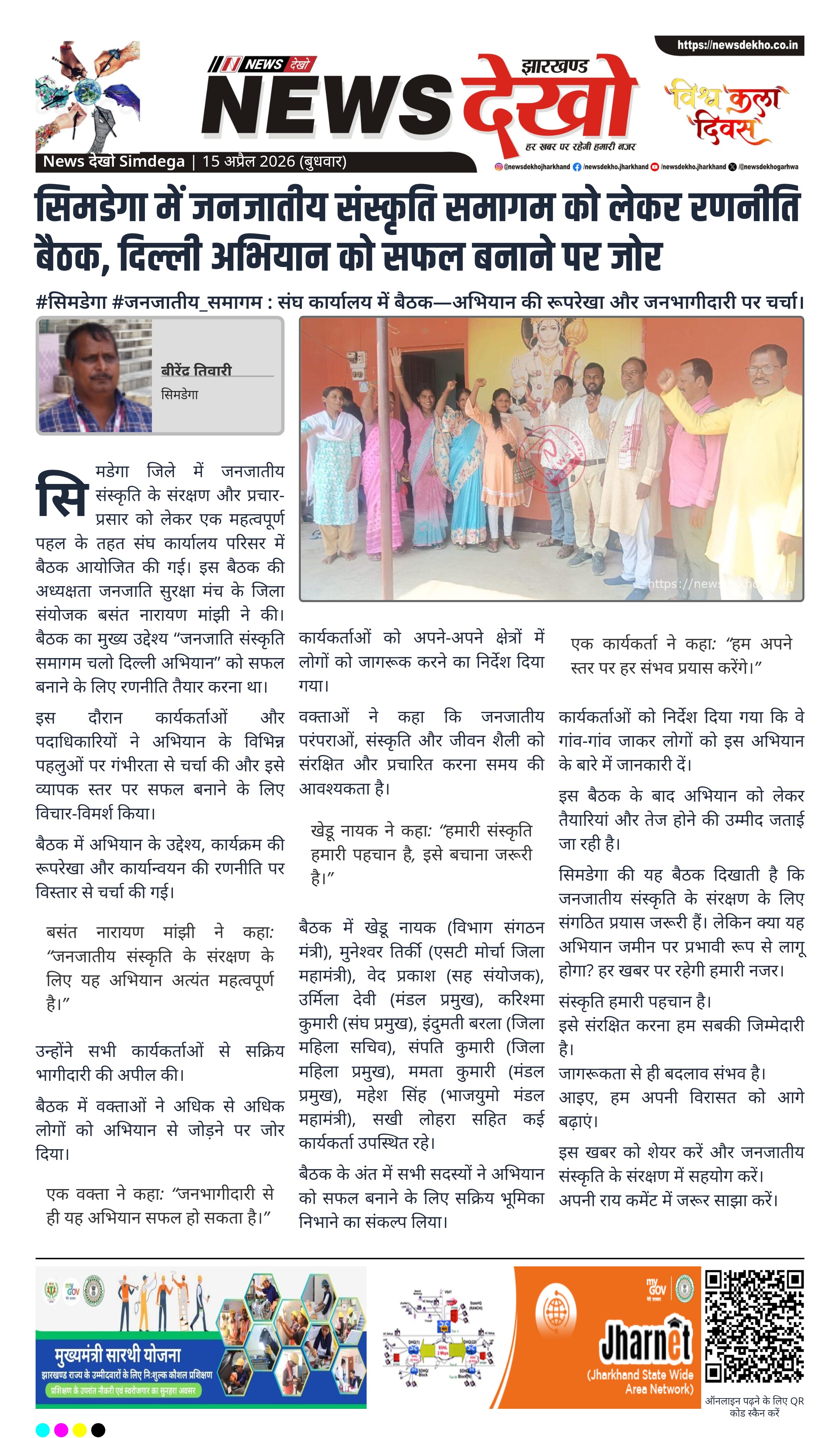 सिमडेगा जिले में जनजातीय संस्कृति के संरक्षण और प्रचार-प्रसार को लेकर एक महत्वपूर्ण पहल के तहत संघ कार्यालय परिसर में बैठक आयोजित की गई। इस बैठक की अध्यक्षता जनजाति सुरक्षा मंच के जिला संयोजक बसंत नारायण मांझी ने की। बैठक का मुख्य उद्देश्य “जनजाति संस्कृति समागम चलो दिल्ली अभियान” को सफल बनाने के लिए रणनीति तैयार करना था।