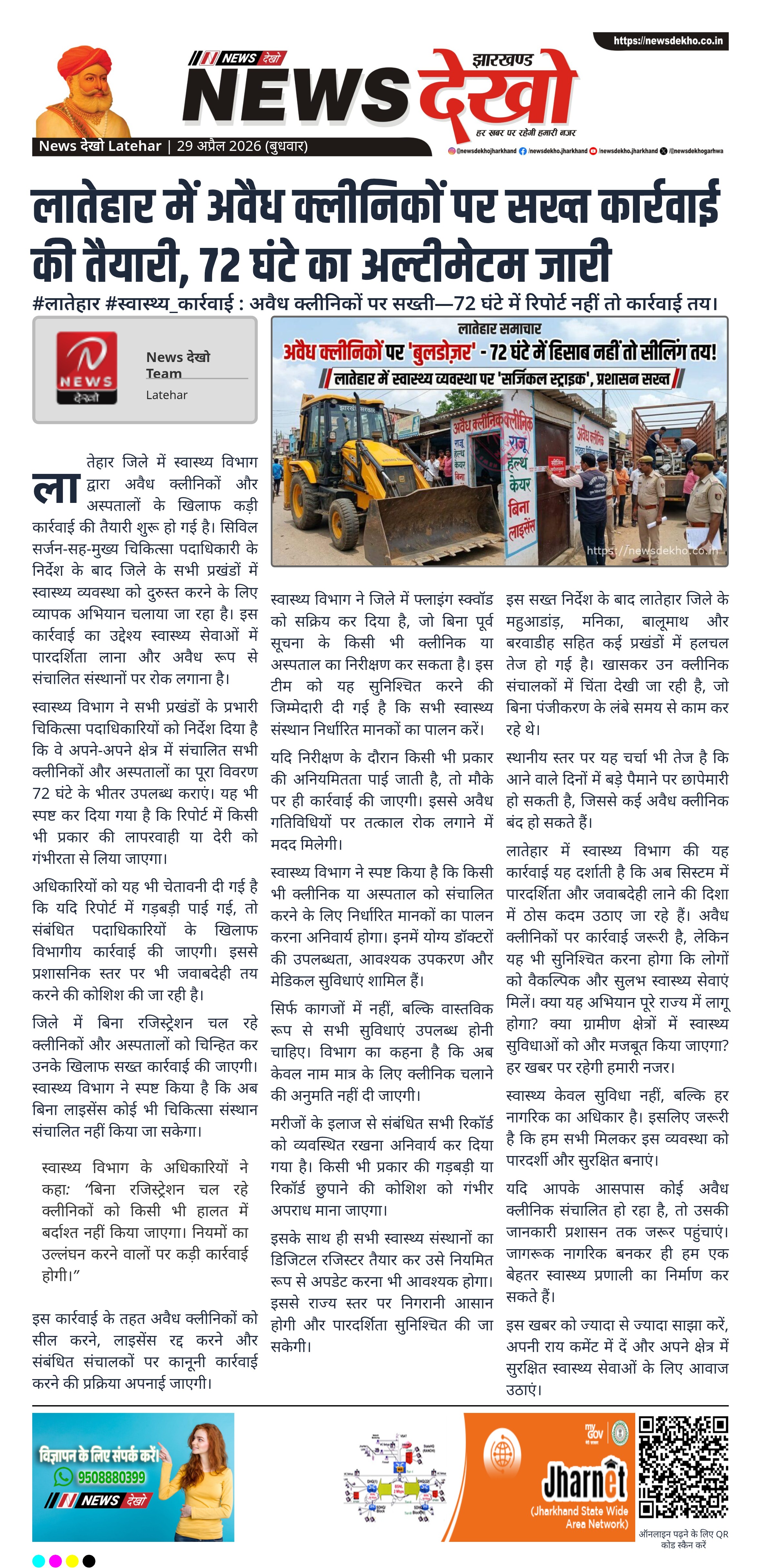 #लातेहार #स्वास्थ्य_कार्रवाई : अवैध क्लीनिकों पर सख्ती—72 घंटे में रिपोर्ट नहीं तो कार्रवाई तय।