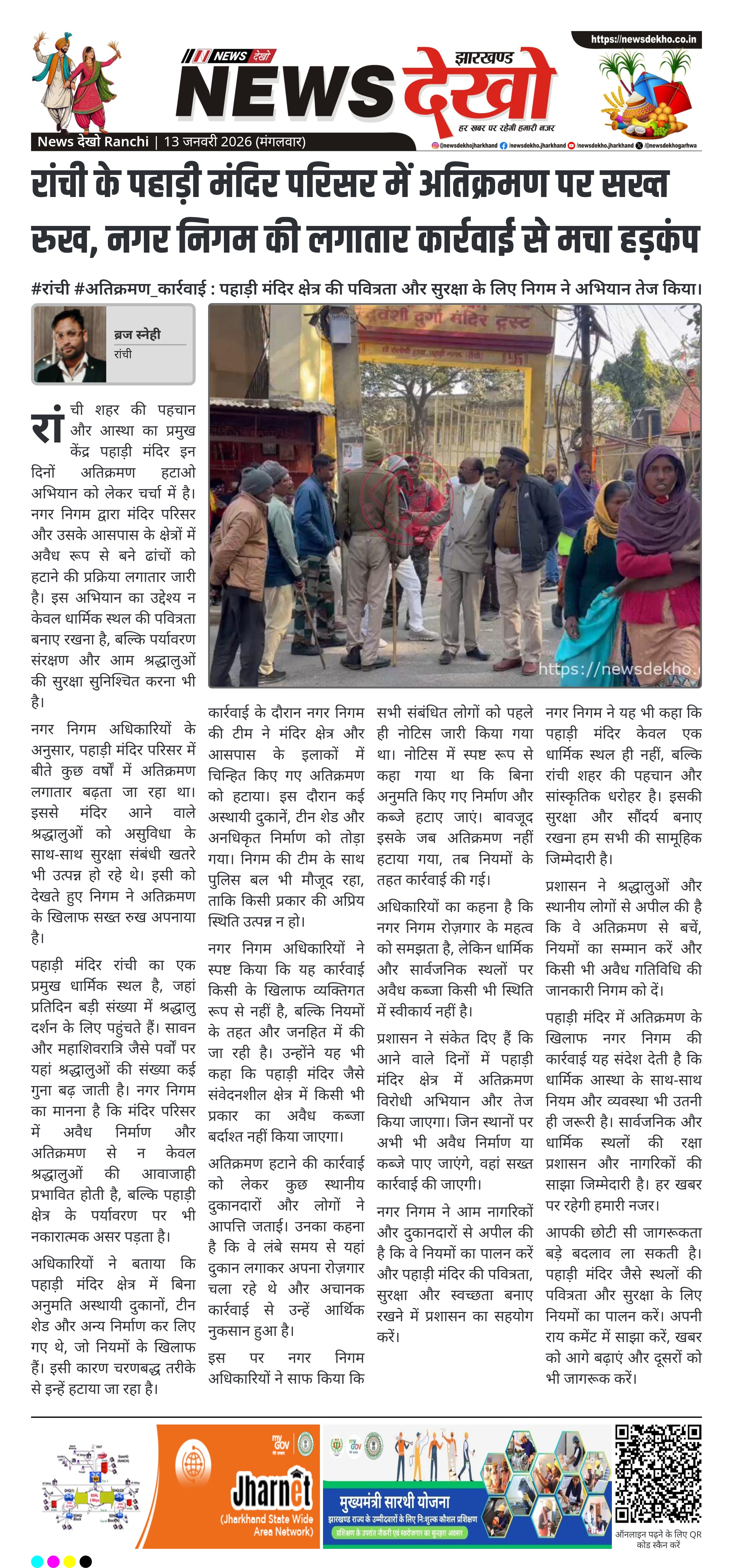रांची के प्रसिद्ध धार्मिक स्थल पहाड़ी मंदिर परिसर में बढ़ते अतिक्रमण के खिलाफ नगर निगम ने सख्त कार्रवाई शुरू कर दी है। मंदिर क्षेत्र और आसपास अवैध रूप से बने ढांचों को चिन्हित कर हटाया जा रहा है। निगम का कहना है कि धार्मिक, पर्यावरणीय और सुरक्षा कारणों से यह अभियान जरूरी है। आने वाले दिनों में कार्रवाई और तेज की जाएगी।