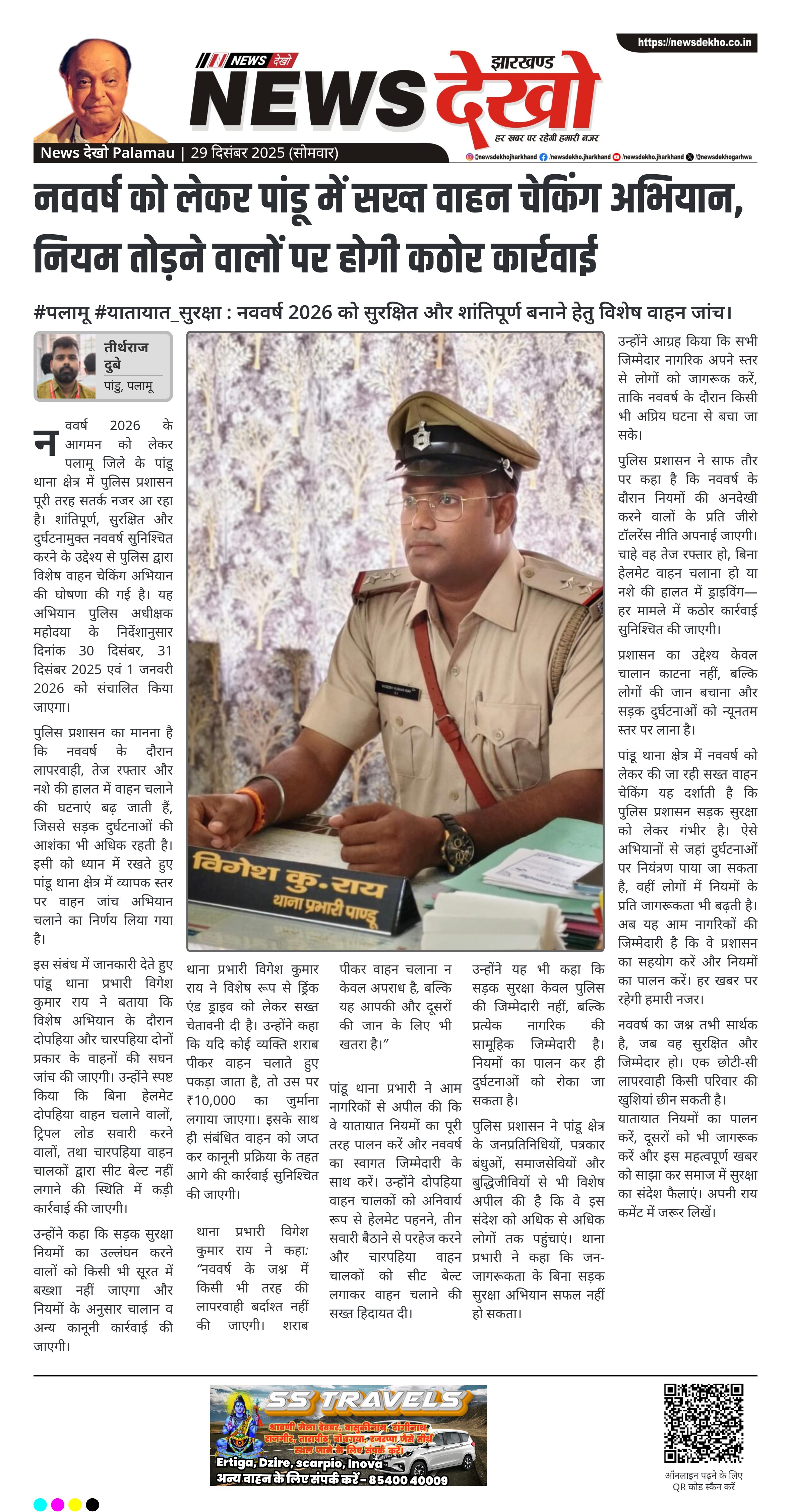 नववर्ष 2026 के आगमन को लेकर पलामू जिले के पांडू थाना क्षेत्र में पुलिस प्रशासन पूरी तरह सतर्क नजर आ रहा है। शांतिपूर्ण, सुरक्षित और दुर्घटनामुक्त नववर्ष सुनिश्चित करने के उद्देश्य से पुलिस द्वारा विशेष वाहन चेकिंग अभियान की घोषणा की गई है। यह अभियान पुलिस अधीक्षक महोदया के निर्देशानुसार दिनांक 30 दिसंबर, 31 दिसंबर 2025 एवं 1 जनवरी 2026 को संचालित किया जाएगा।