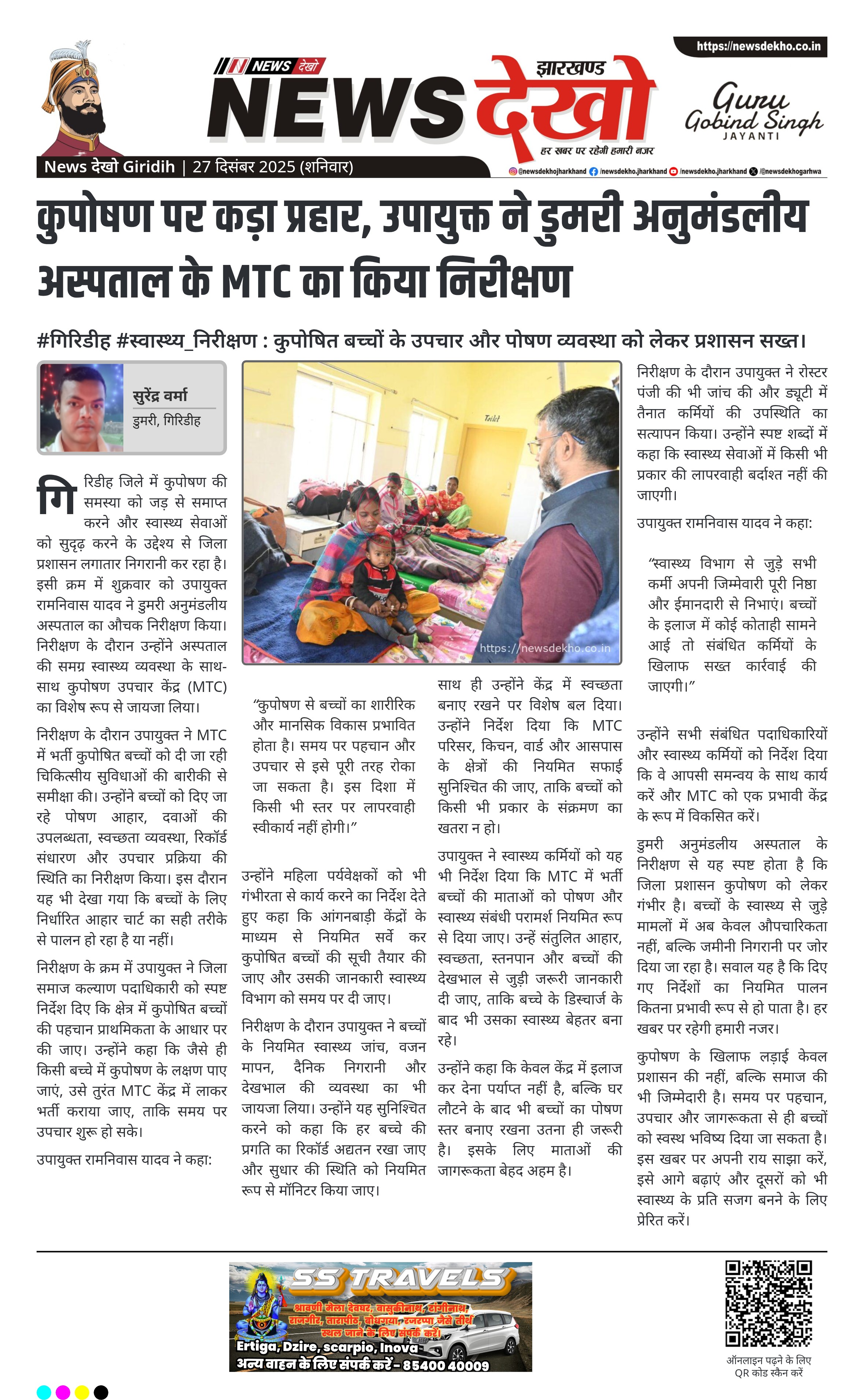 गिरिडीह जिले में स्वास्थ्य सुविधाओं को मजबूत करने और कुपोषण की समस्या को समाप्त करने के लिए जिला प्रशासन सक्रिय नजर आ रहा है। शुक्रवार को उपायुक्त रामनिवास यादव ने डुमरी अनुमंडलीय अस्पताल का निरीक्षण किया। इस दौरान उन्होंने विशेष रूप से कुपोषण उपचार केंद्र (MTC) की व्यवस्थाओं की गहन समीक्षा की। निरीक्षण का उद्देश्य कुपोषित बच्चों को समय पर गुणवत्तापूर्ण उपचार और पोषण उपलब्ध कराना रहा।