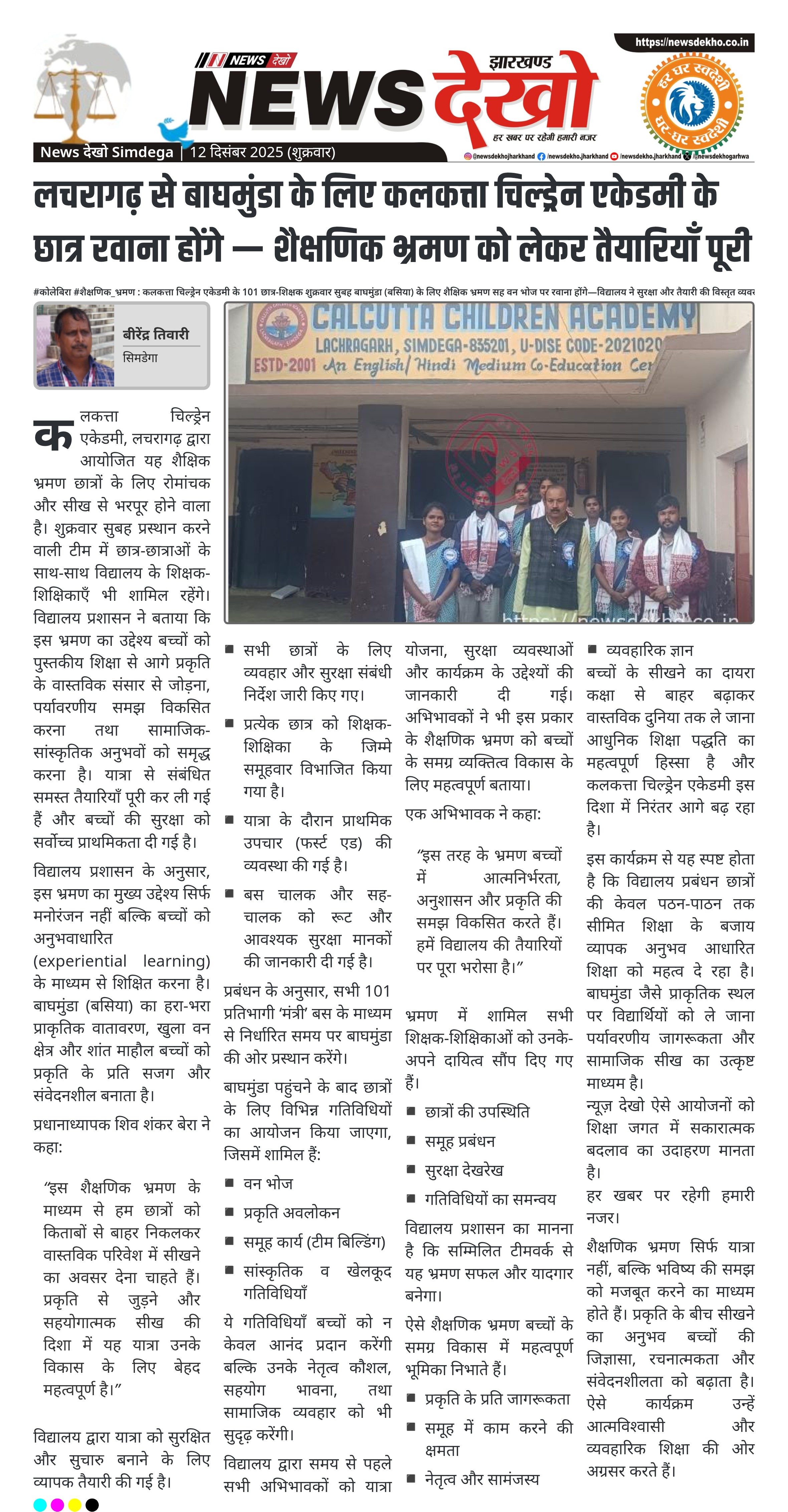 - कलकत्ता चिल्ड्रेन एकेडमी, लचरागढ़ के छात्र-छात्राएं 13 दिसंबर, शुक्रवार को शैक्षिक भ्रमण पर जाएंगे।