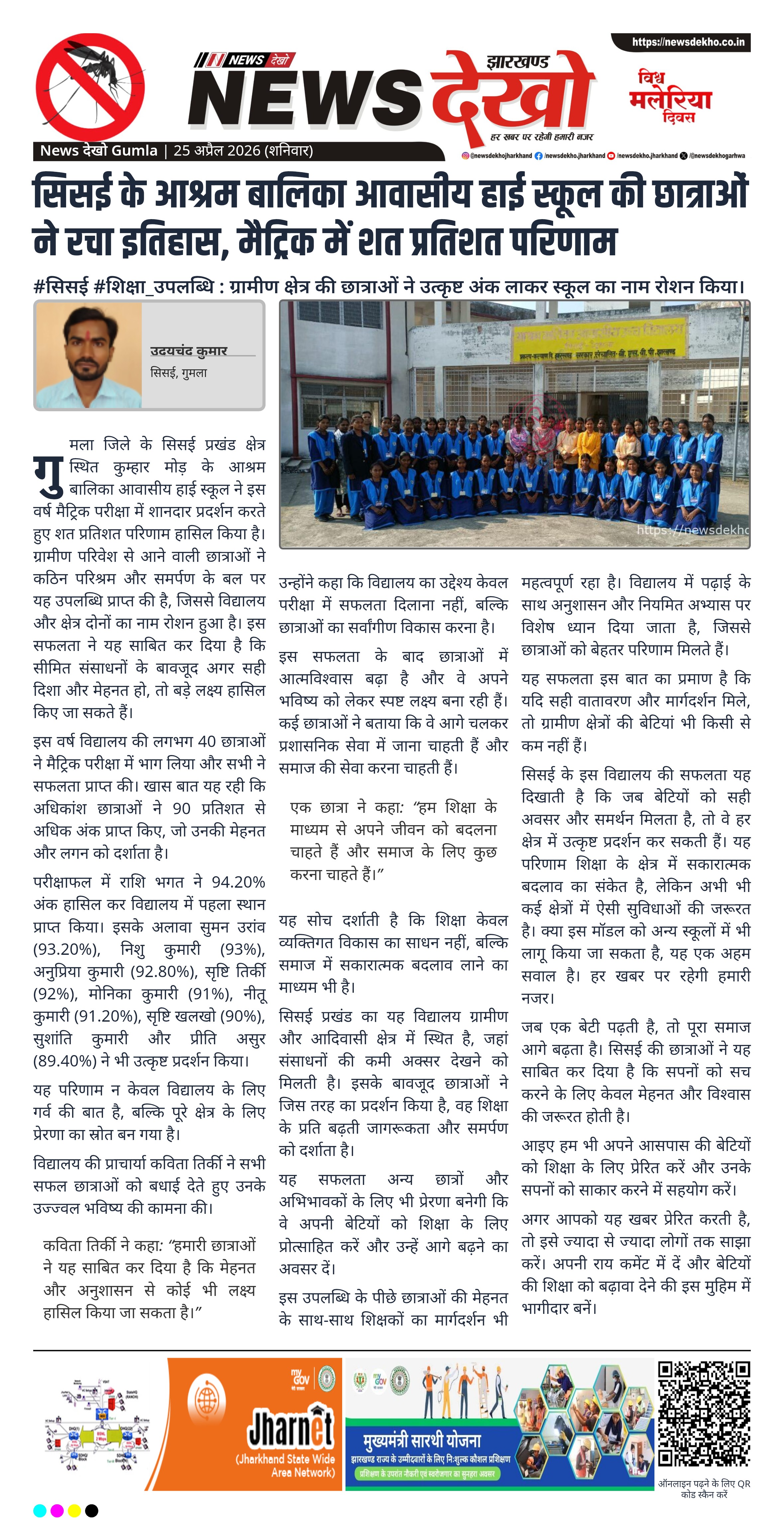 - आश्रम बालिका आवासीय हाई स्कूल, सिसई का रिजल्ट शत प्रतिशत रहा।