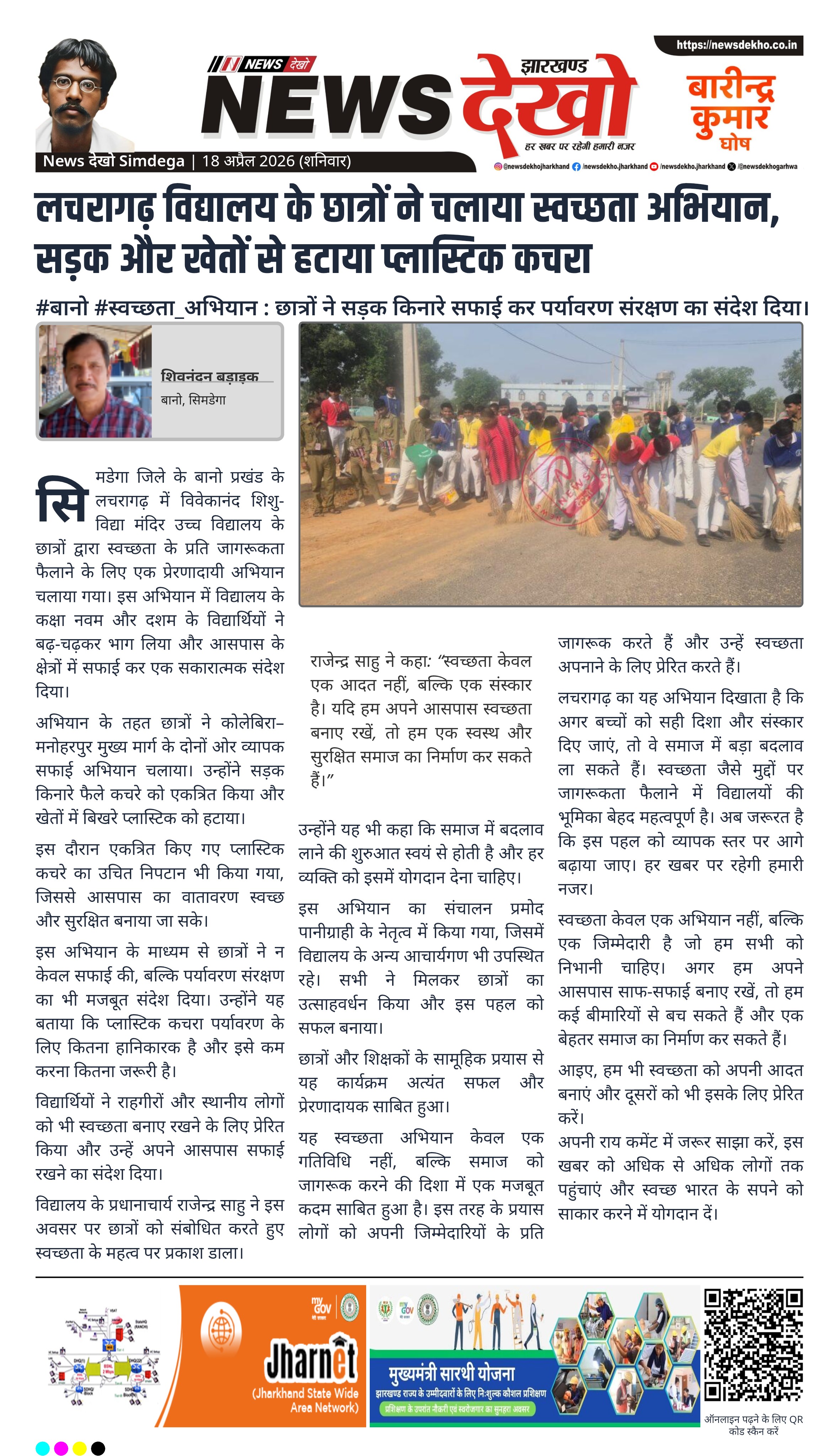 सिमडेगा जिले के बानो प्रखंड के लचरागढ़ में विवेकानंद शिशु-विद्या मंदिर उच्च विद्यालय के छात्रों द्वारा स्वच्छता के प्रति जागरूकता फैलाने के लिए एक प्रेरणादायी अभियान चलाया गया। इस अभियान में विद्यालय के कक्षा नवम और दशम के विद्यार्थियों ने बढ़-चढ़कर भाग लिया और आसपास के क्षेत्रों में सफाई कर एक सकारात्मक संदेश दिया।