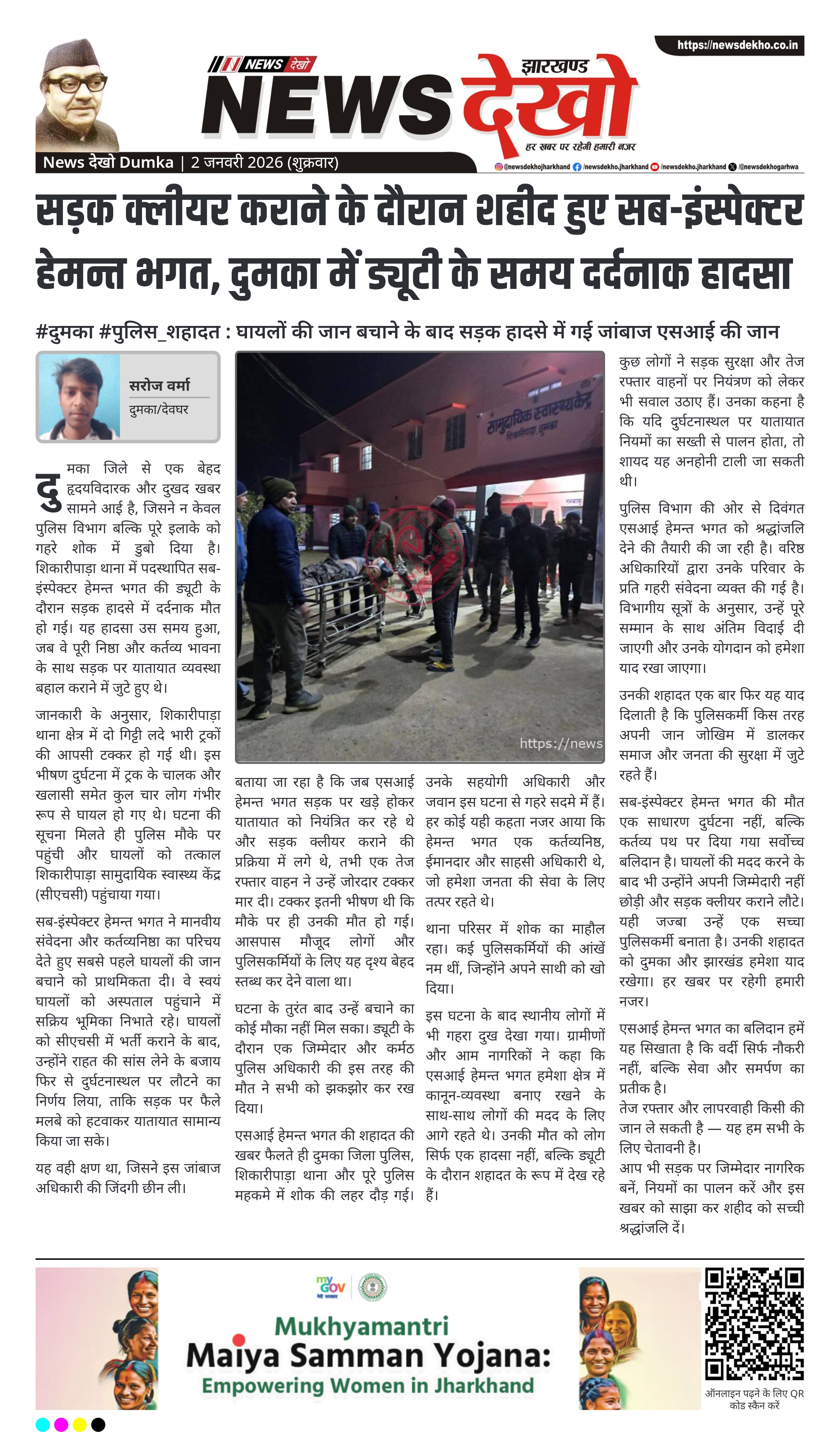 सब-इंस्पेक्टर हेमन्त भगत की मौत एक साधारण दुर्घटना नहीं, बल्कि कर्तव्य पथ पर दिया गया सर्वोच्च बलिदान है। घायलों की मदद करने के बाद भी उन्होंने अपनी जिम्मेदारी नहीं छोड़ी और सड़क क्लीयर कराने लौटे। यही जज्बा उन्हें एक सच्चा पुलिसकर्मी बनाता है। उनकी शहादत को दुमका और झारखंड हमेशा याद रखेगा। हर खबर पर रहेगी हमारी नजर।