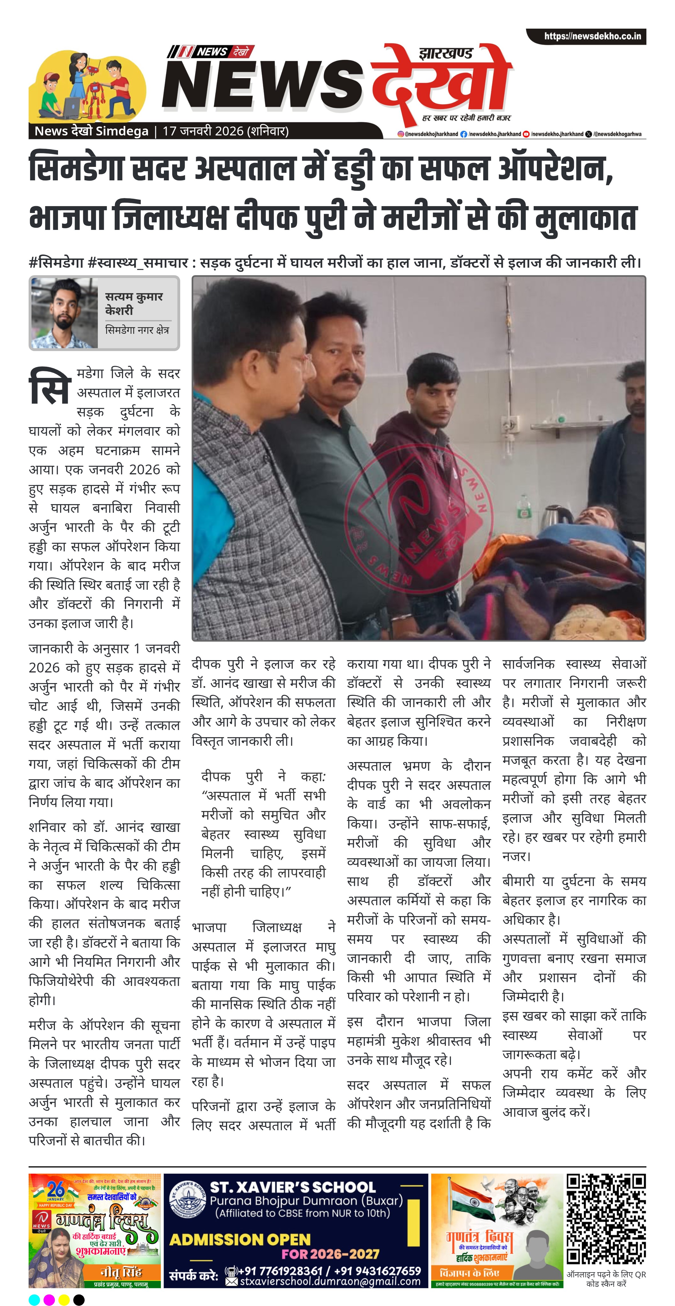 सिमडेगा सदर अस्पताल में हड्डी का सफल ऑपरेशन, भाजपा जिलाध्यक्ष दीपक पुरी ने मरीजों से की मुलाकात
