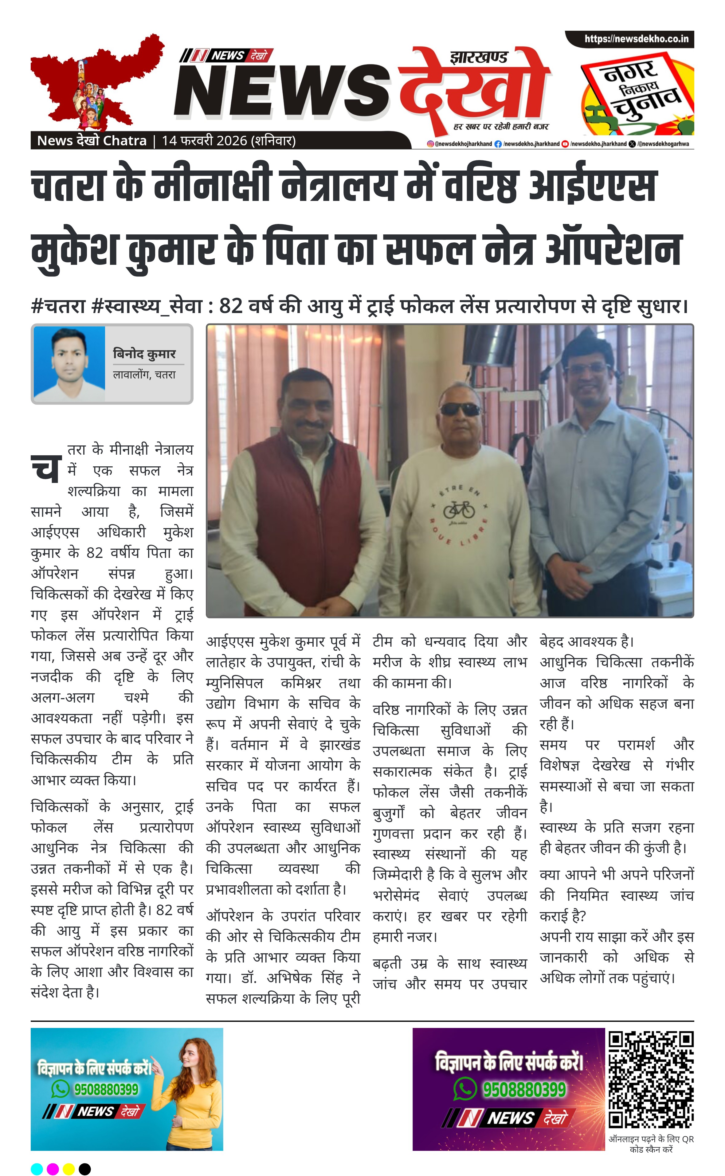 चतरा के मीनाक्षी नेत्रालय में एक सफल नेत्र शल्यक्रिया का मामला सामने आया है, जिसमें आईएएस अधिकारी मुकेश कुमार के 82 वर्षीय पिता का ऑपरेशन संपन्न हुआ। चिकित्सकों की देखरेख में किए गए इस ऑपरेशन में ट्राई फोकल लेंस प्रत्यारोपित किया गया, जिससे अब उन्हें दूर और नजदीक की दृष्टि के लिए अलग-अलग चश्मे की आवश्यकता नहीं पड़ेगी। इस सफल उपचार के बाद परिवार ने चिकित्सकीय टीम के प्रति आभार व्यक्त किया।