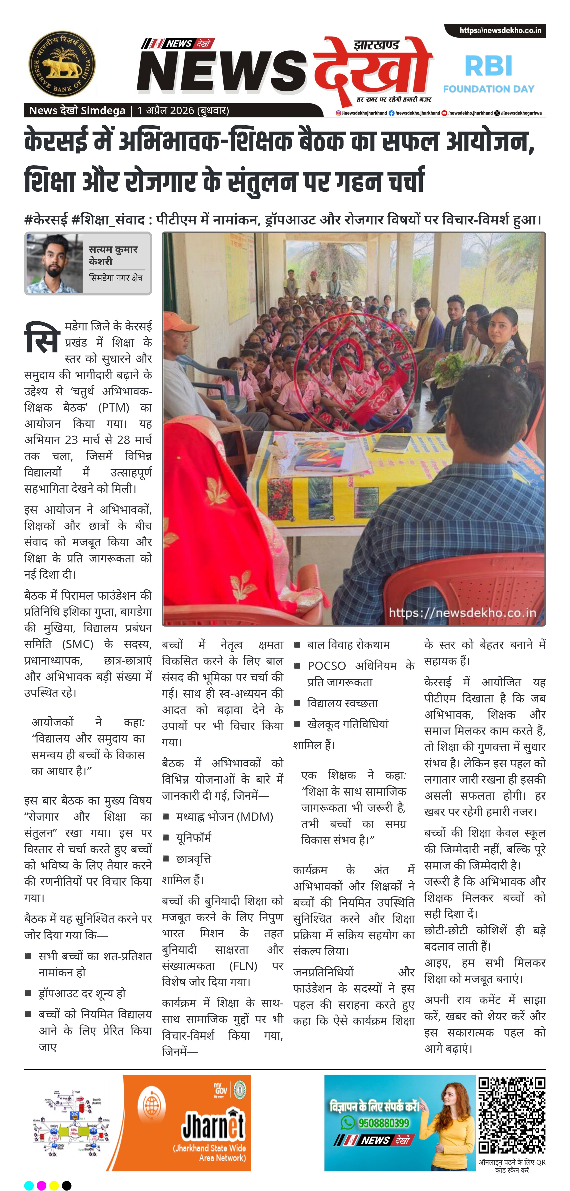 सिमडेगा जिले के केरसई प्रखंड में 23 से 28 मार्च तक चतुर्थ अभिभावक-शिक्षक बैठक आयोजित की गई। इस दौरान शिक्षा और रोजगार के संतुलन पर व्यापक चर्चा हुई। बैठक में अभिभावकों, शिक्षकों और जनप्रतिनिधियों की सक्रिय भागीदारी रही। कार्यक्रम का उद्देश्य बच्चों के सर्वांगीण विकास और विद्यालय-समुदाय समन्वय को मजबूत करना था।