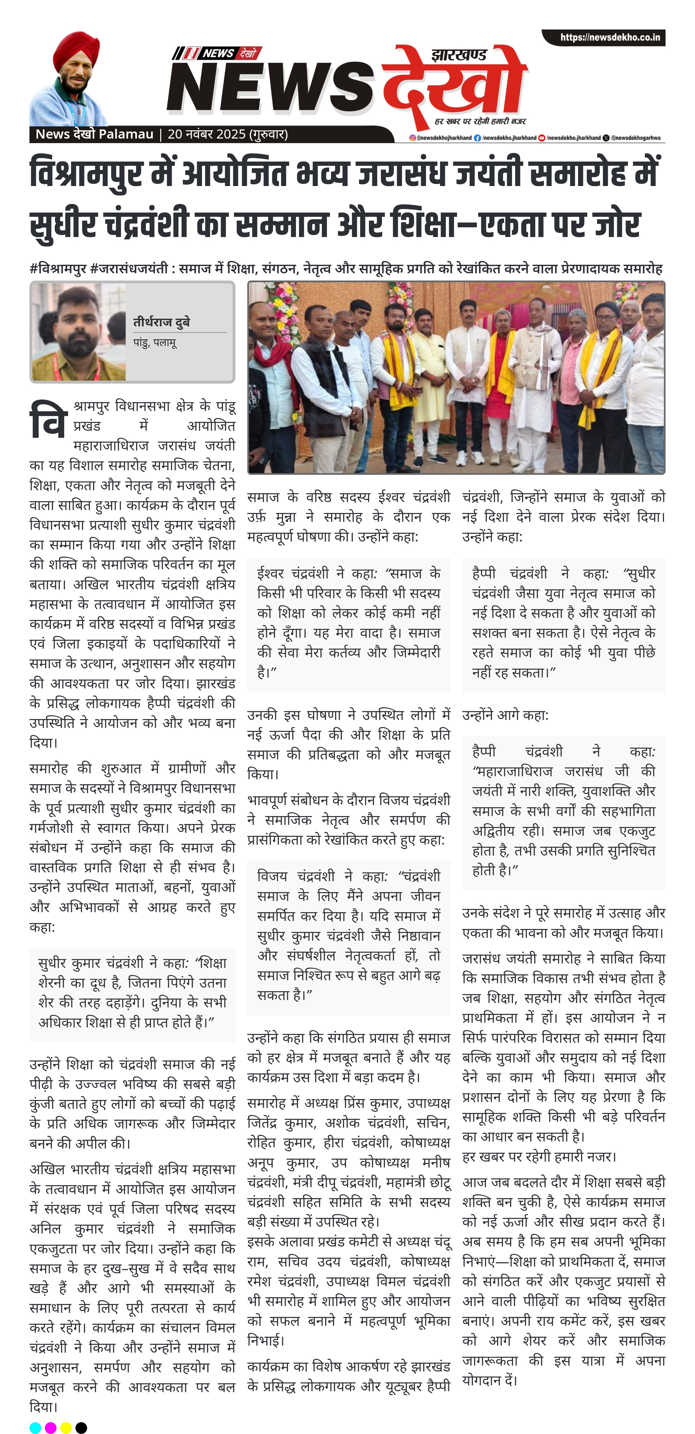 विश्रामपुर विधानसभा क्षेत्र के पांडू प्रखंड में आयोजित महाराजाधिराज जरासंध जयंती का यह विशाल समारोह समाजिक चेतना, शिक्षा, एकता और नेतृत्व को मजबूती देने वाला साबित हुआ। कार्यक्रम के दौरान पूर्व विधानसभा प्रत्याशी सुधीर कुमार चंद्रवंशी का सम्मान किया गया और उन्होंने शिक्षा की शक्ति को समाजिक परिवर्तन का मूल बताया। अखिल भारतीय चंद्रवंशी क्षत्रिय महासभा के तत्वावधान में आयोजित इस कार्यक्रम में वरिष्ठ सदस्यों व विभिन्न प्रखंड एवं जिला इकाइयों के पदाधिकारियों ने समाज के उत्थान, अनुशासन और सहयोग की आवश्यकता पर जोर दिया। झारखंड के प्रसिद्ध लोकगायक हैप्पी चंद्रवंशी की उपस्थिति ने आयोजन को और भव्य बना दिया।