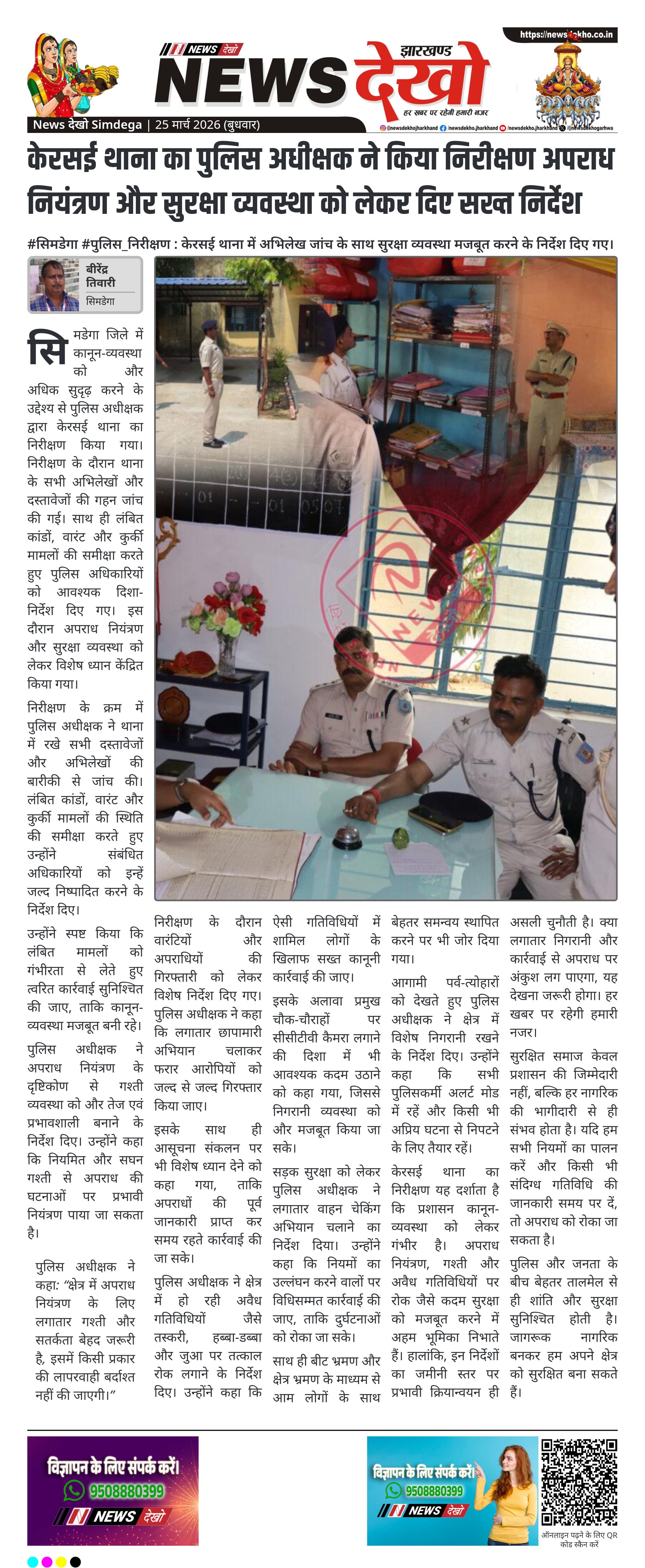 सिमडेगा जिले में पुलिस अधीक्षक द्वारा केरसई थाना का निरीक्षण किया गया, जिसमें थाना के अभिलेखों, लंबित मामलों और सुरक्षा व्यवस्था की समीक्षा की गई। निरीक्षण के दौरान अपराध नियंत्रण, गश्ती बढ़ाने और वारंटियों की गिरफ्तारी को लेकर दिशा-निर्देश दिए गए। आगामी पर्व-त्योहारों को देखते हुए विशेष सतर्कता बरतने पर जोर दिया गया।