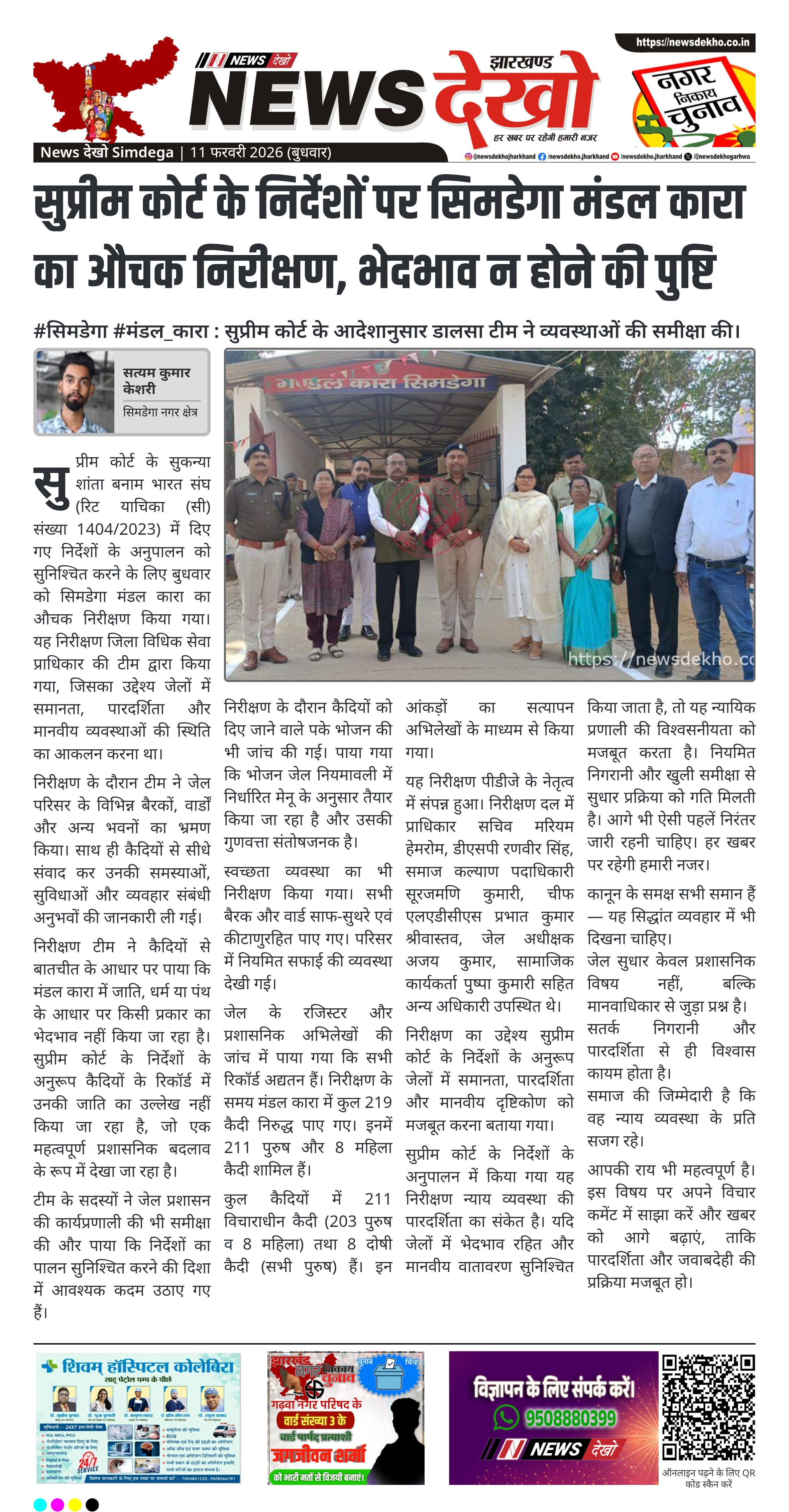 सुप्रीम कोर्ट के सुकन्या शांता बनाम भारत संघ मामले में दिए गए निर्देशों के अनुपालन में सिमडेगा मंडल कारा का औचक निरीक्षण किया गया। जिला विधिक सेवा प्राधिकार की टीम ने जेल की व्यवस्थाओं, अभिलेखों और कैदियों की सुविधाओं की जांच की। निरीक्षण में जाति या धर्म के आधार पर किसी भेदभाव की पुष्टि नहीं हुई। जेल प्रशासन की व्यवस्थाएं संतोषजनक पाई गईं।