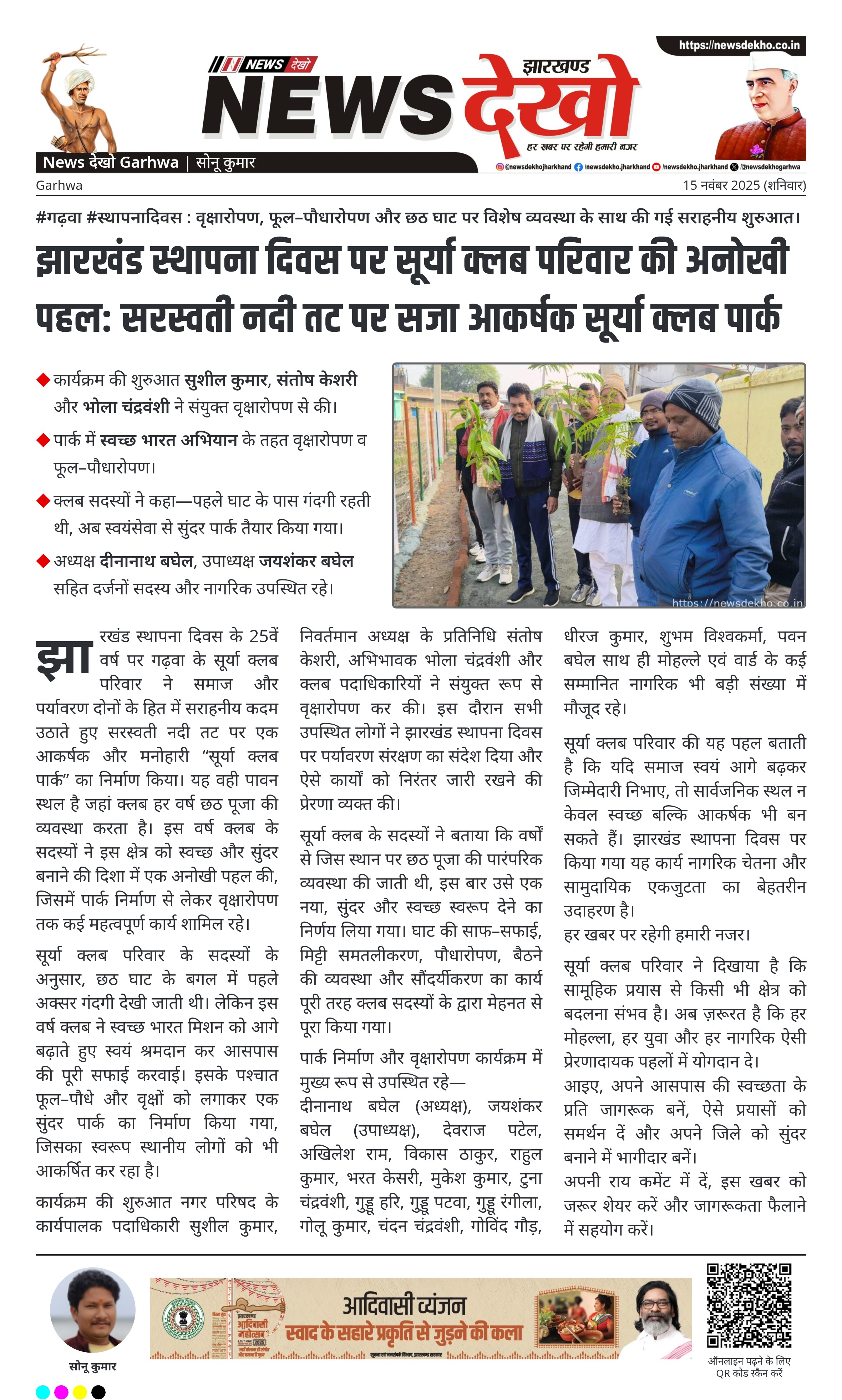 झारखंड स्थापना दिवस के 25वें वर्ष पर गढ़वा के सूर्या क्लब परिवार ने समाज और पर्यावरण दोनों के हित में सराहनीय कदम उठाते हुए सरस्वती नदी तट पर एक आकर्षक और मनोहारी “सूर्या क्लब पार्क” का निर्माण किया। यह वही पावन स्थल है जहां क्लब हर वर्ष छठ पूजा की व्यवस्था करता है। इस वर्ष क्लब के सदस्यों ने इस क्षेत्र को स्वच्छ और सुंदर बनाने की दिशा में एक अनोखी पहल की, जिसमें पार्क निर्माण से लेकर वृक्षारोपण तक कई महत्वपूर्ण कार्य शामिल रहे।