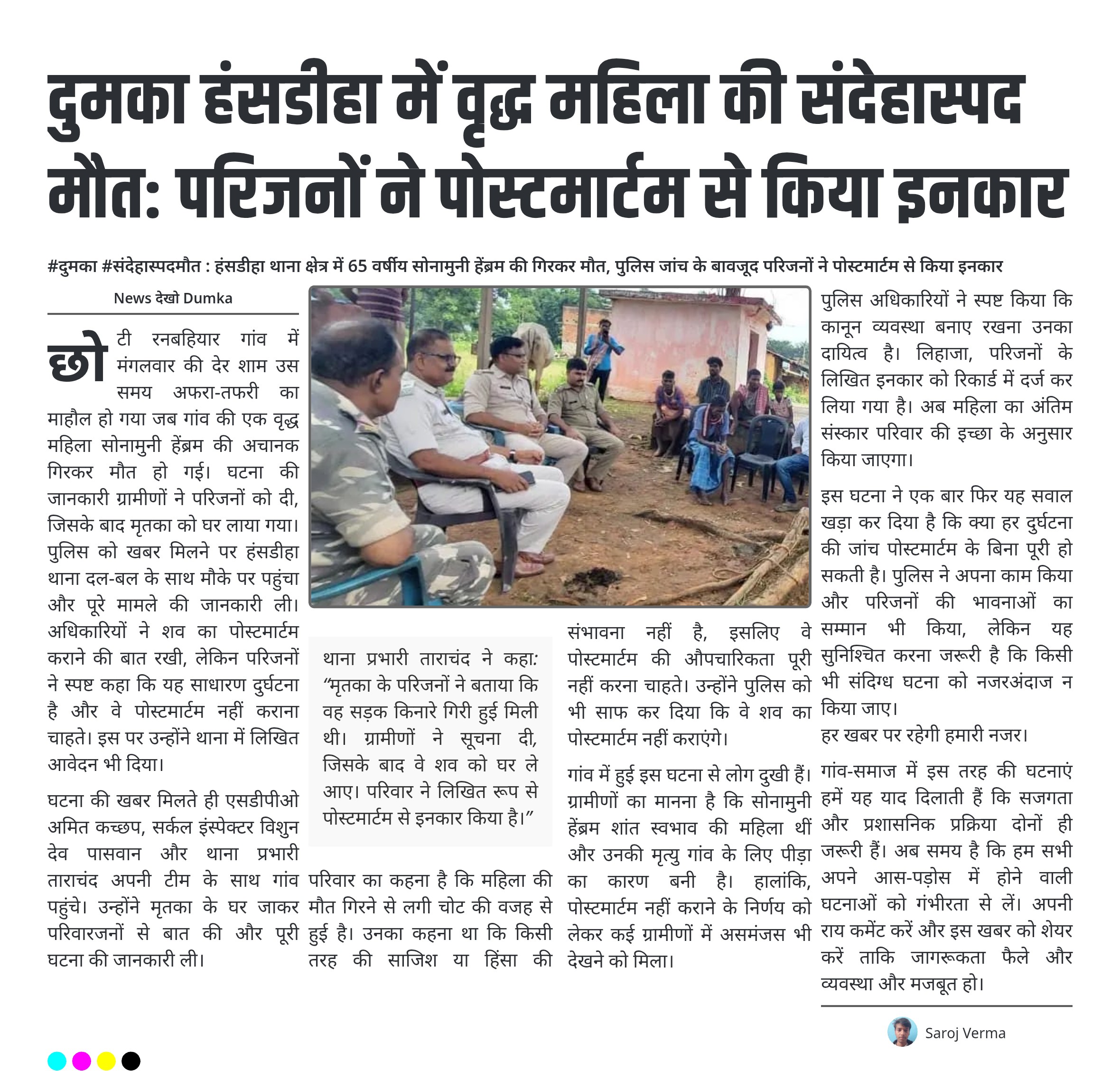 #दुमका #संदेहास्पदमौत : हंसडीहा थाना क्षेत्र में 65 वर्षीय सोनामुनी हेंब्रम की गिरकर मौत, पुलिस जांच के बावजूद परिजनों ने पोस्टमार्टम से किया इनकार