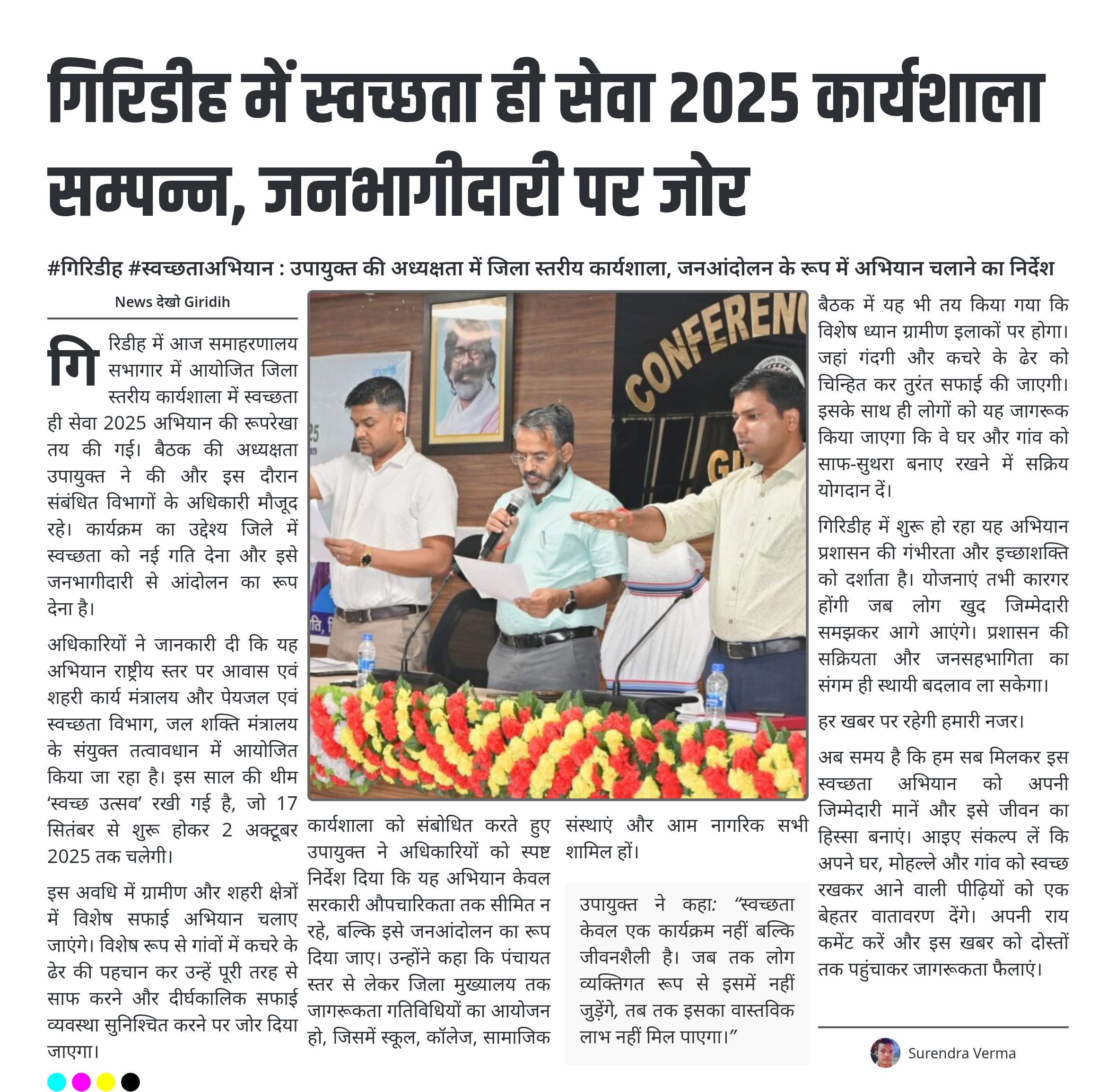 - समाहरणालय सभागार गिरिडीह में उपायुक्त की अध्यक्षता में स्वच्छता ही सेवा 2025 की कार्यशाला आयोजित हुई।