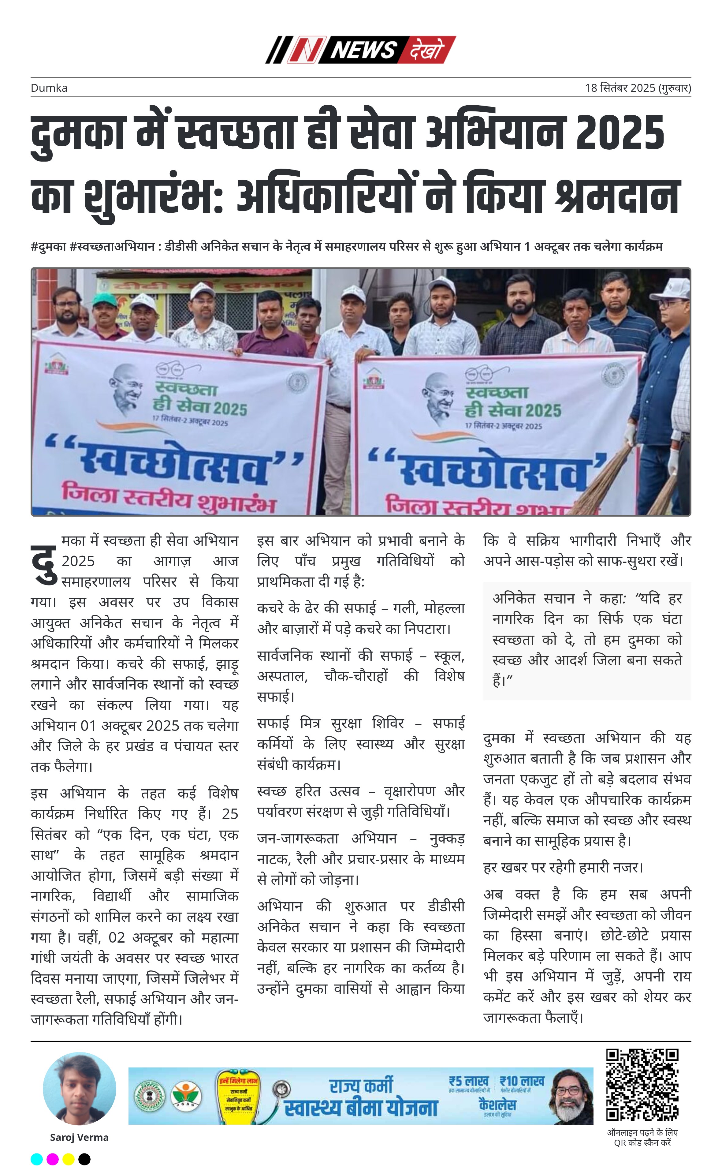 - स्वच्छता ही सेवा अभियान 2025 का शुभारंभ दुमका समाहरणालय परिसर से हुआ।