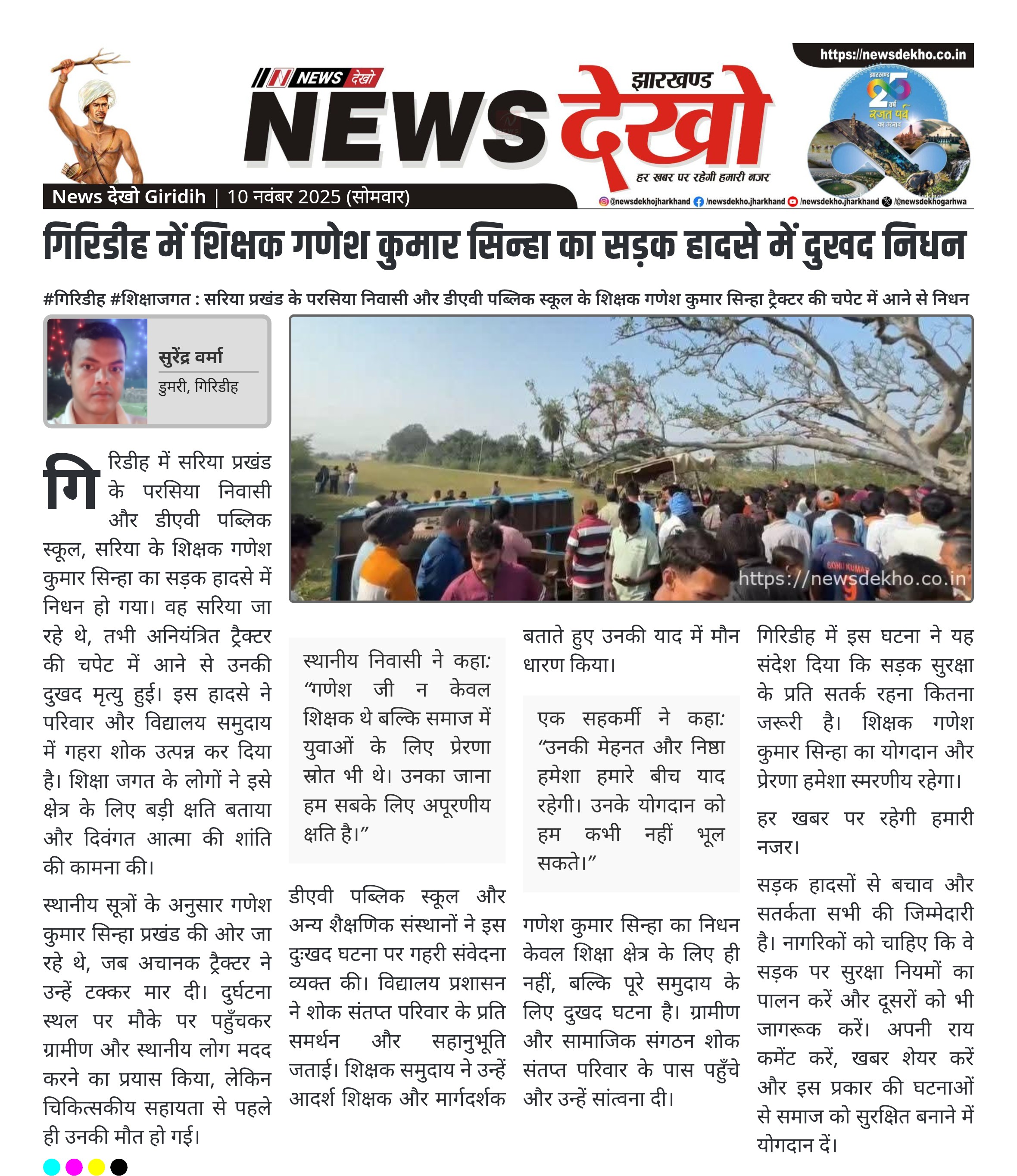 #गिरिडीह #शिक्षाजगत : सरिया प्रखंड के परसिया निवासी और डीएवी पब्लिक स्कूल के शिक्षक गणेश कुमार सिन्हा ट्रैक्टर की चपेट में आने से निधन