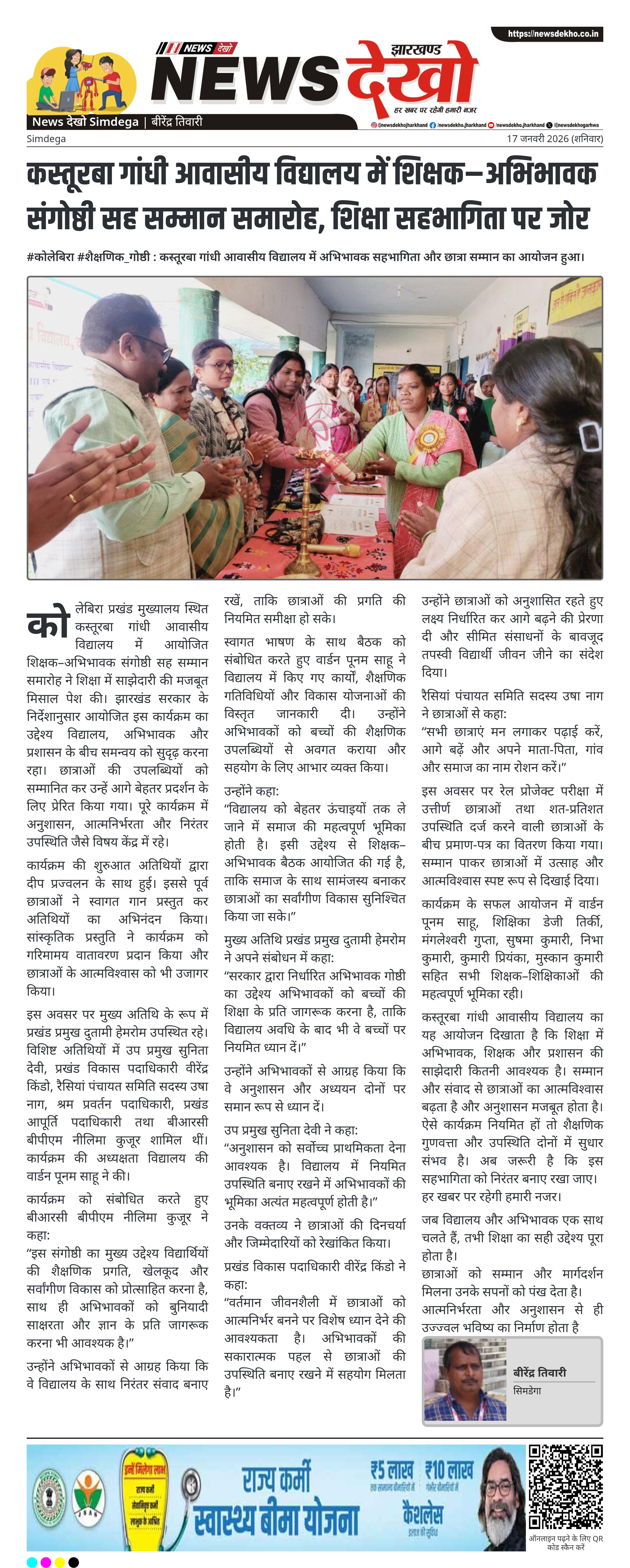 कोलेबिरा प्रखंड मुख्यालय स्थित कस्तूरबा गांधी आवासीय विद्यालय में आयोजित शिक्षक–अभिभावक संगोष्ठी सह सम्मान समारोह ने शिक्षा में साझेदारी की मजबूत मिसाल पेश की। झारखंड सरकार के निर्देशानुसार आयोजित इस कार्यक्रम का उद्देश्य विद्यालय, अभिभावक और प्रशासन के बीच समन्वय को सुदृढ़ करना रहा। छात्राओं की उपलब्धियों को सम्मानित कर उन्हें आगे बेहतर प्रदर्शन के लिए प्रेरित किया गया। पूरे कार्यक्रम में अनुशासन, आत्मनिर्भरता और निरंतर उपस्थिति जैसे विषय केंद्र में रहे।