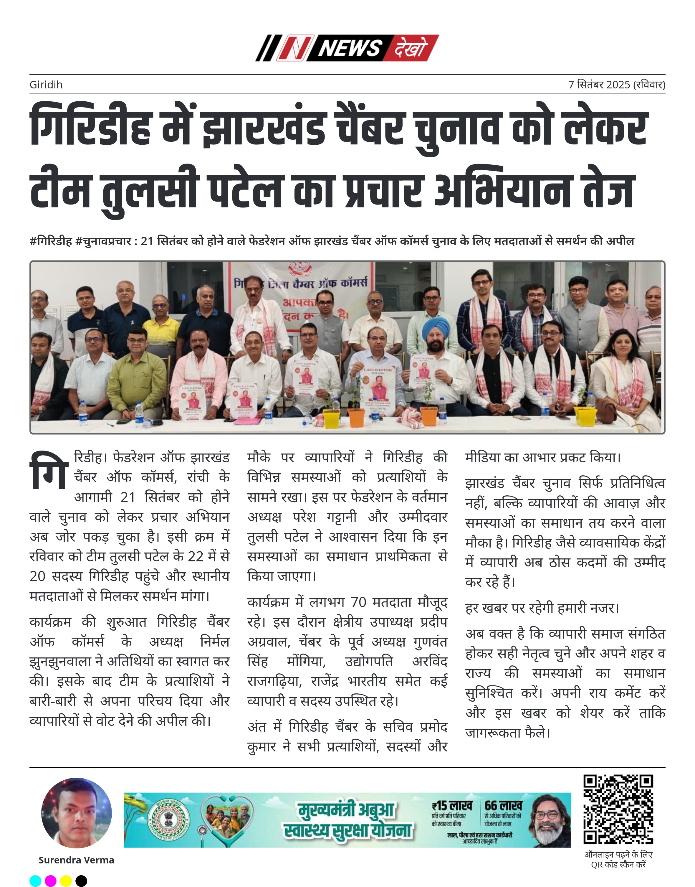 गिरिडीह। फेडरेशन ऑफ झारखंड चैंबर ऑफ कॉमर्स, रांची के आगामी 21 सितंबर को होने वाले चुनाव को लेकर प्रचार अभियान अब जोर पकड़ चुका है। इसी क्रम में रविवार को टीम तुलसी पटेल के 22 में से 20 सदस्य गिरिडीह पहुंचे और स्थानीय मतदाताओं से मिलकर समर्थन मांगा।