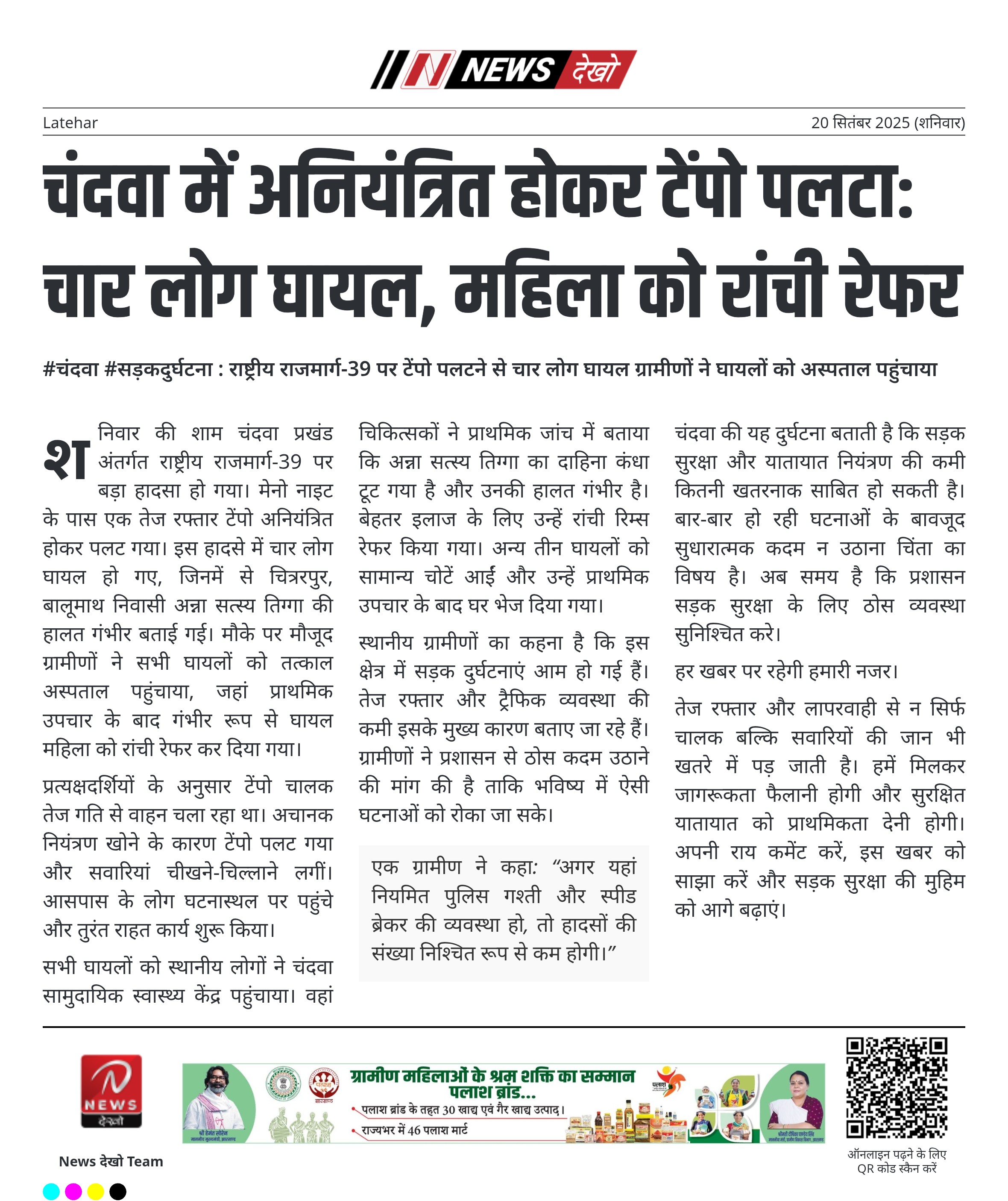 चंदवा की यह दुर्घटना बताती है कि सड़क सुरक्षा और यातायात नियंत्रण की कमी कितनी खतरनाक साबित हो सकती है। बार-बार हो रही घटनाओं के बावजूद सुधारात्मक कदम न उठाना चिंता का विषय है। अब समय है कि प्रशासन सड़क सुरक्षा के लिए ठोस व्यवस्था सुनिश्चित करे।
