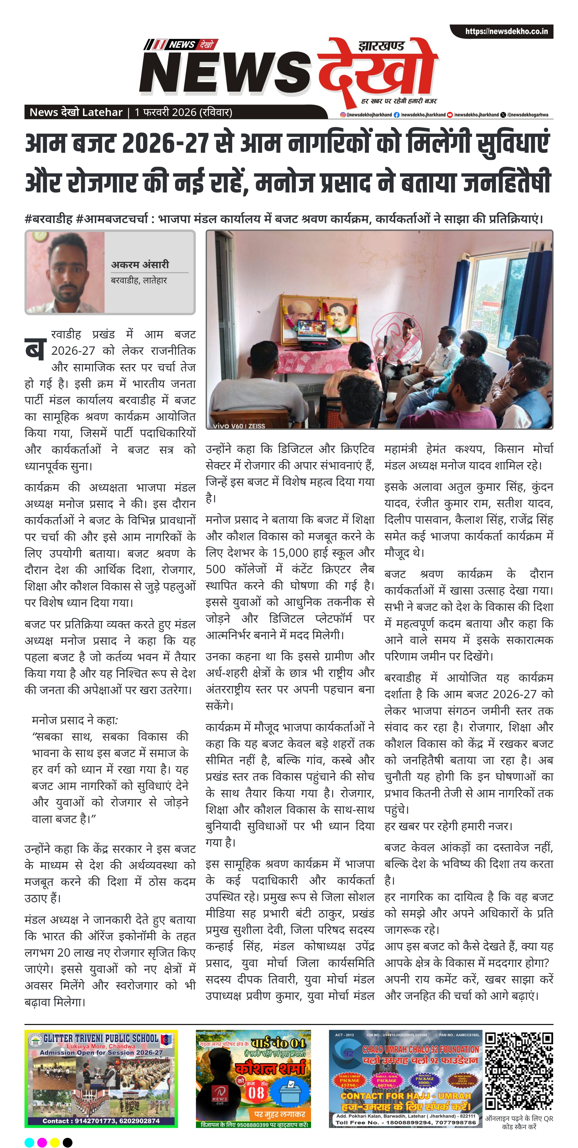 - बरवाडीह भाजपा मंडल कार्यालय में आम बजट 2026-27 का सामूहिक श्रवण।