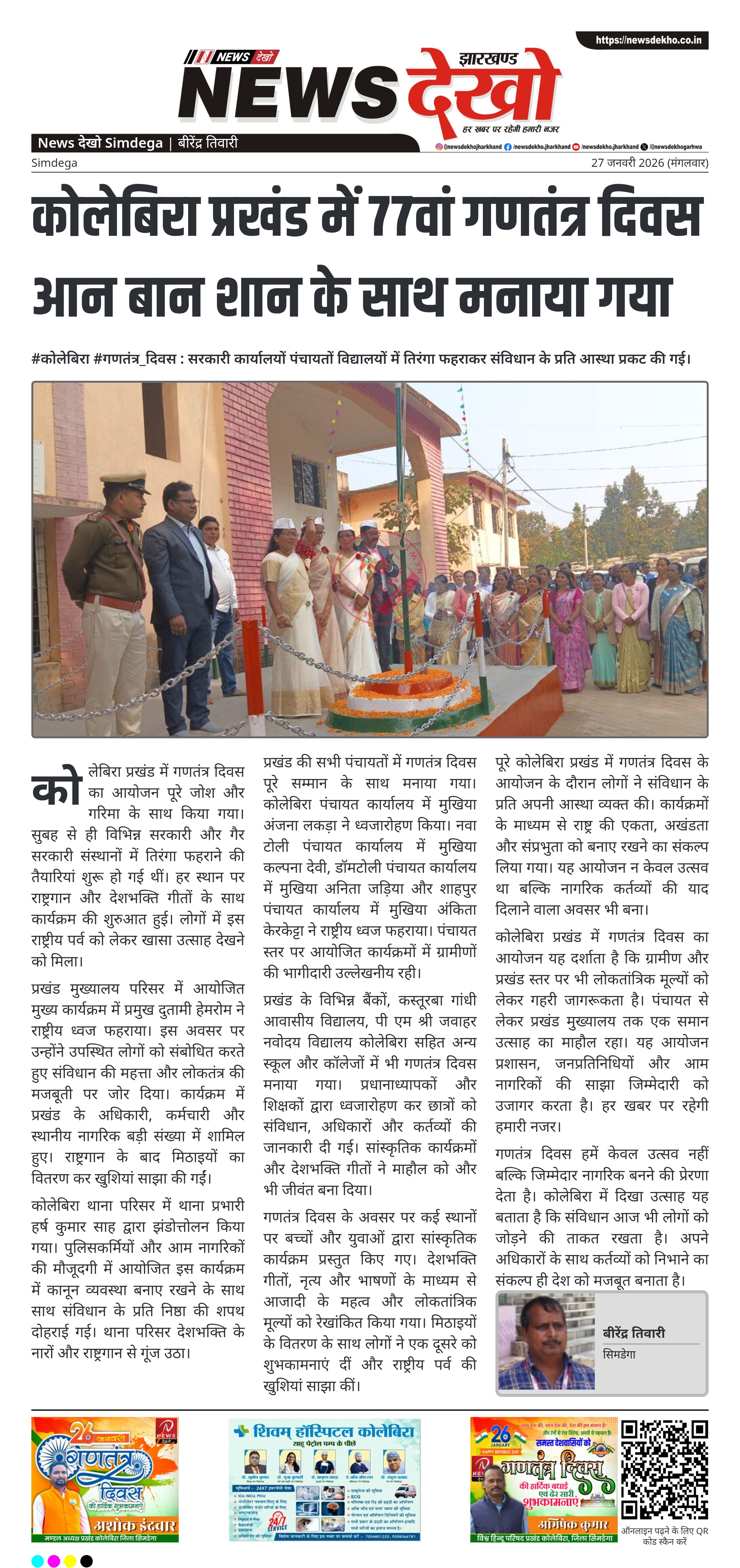 कोलेबिरा प्रखंड में 77वां गणतंत्र दिवस पूरे उत्साह और देशभक्ति के वातावरण में मनाया गया। प्रखंड मुख्यालय से लेकर पंचायत कार्यालयों, थाना, बैंकों और शिक्षण संस्थानों में राष्ट्रीय ध्वज आन बान शान के साथ फहराया गया। कार्यक्रमों में जनप्रतिनिधियों, प्रशासनिक अधिकारियों, शिक्षकों और नागरिकों की सक्रिय भागीदारी रही। इस आयोजन ने संविधान के प्रति सम्मान और राष्ट्रीय एकता का संदेश दिया।