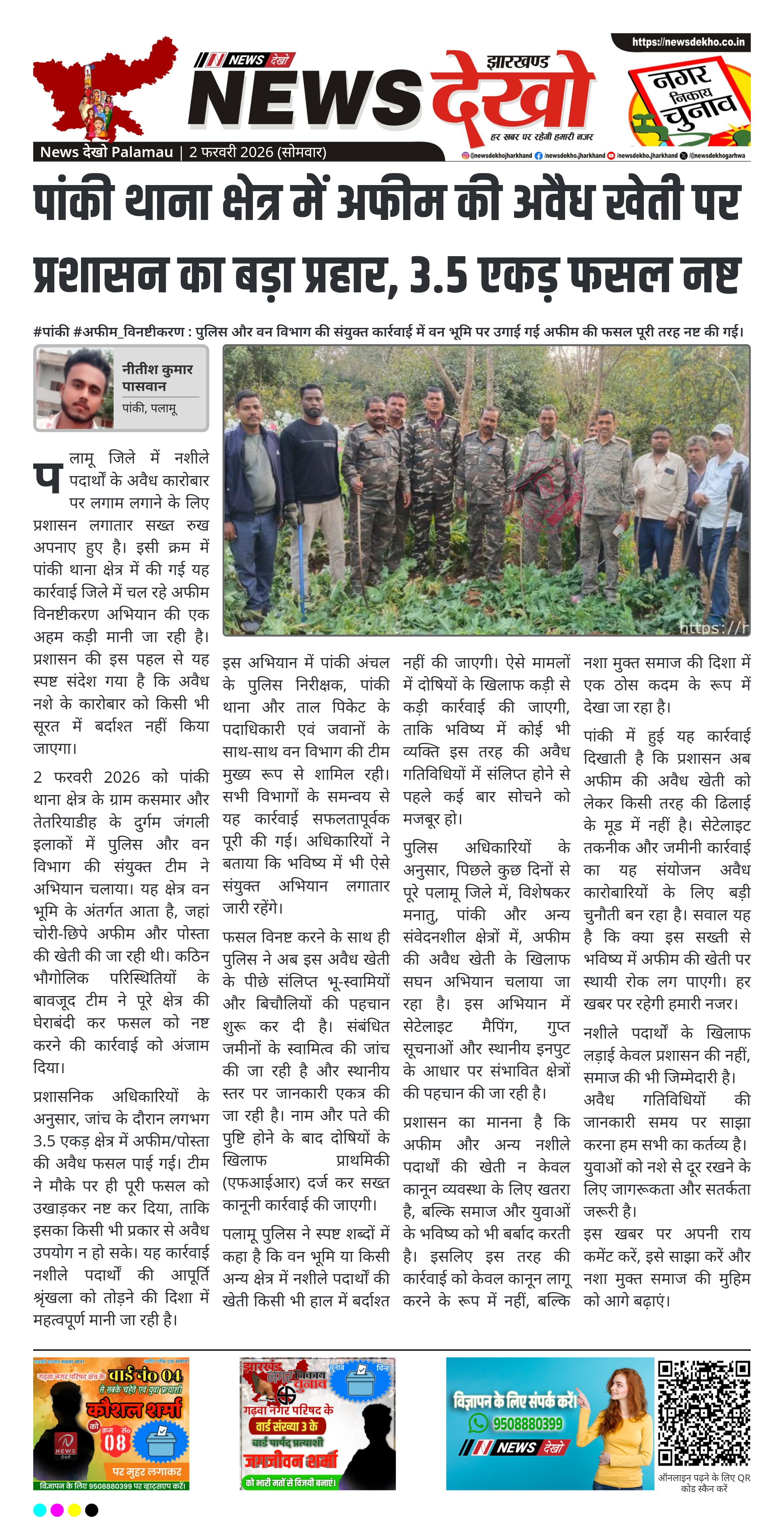 पलामू जिले के पांकी थाना क्षेत्र में अवैध अफीम की खेती के खिलाफ प्रशासन ने सख्त कदम उठाते हुए बड़ी कार्रवाई की है। 2 फरवरी 2026 को पुलिस और वन विभाग की संयुक्त टीम ने कसमार और तेतरियाडीह गांव के दुर्गम वन क्षेत्रों में अभियान चलाया। इस दौरान लगभग 3.5 एकड़ क्षेत्र में फैली अफीम की अवैध फसल को पूरी तरह विनष्ट कर दिया गया। यह कार्रवाई नशीले पदार्थों के खिलाफ चल रहे जिलेव्यापी अभियान का अहम हिस्सा मानी जा रही है।