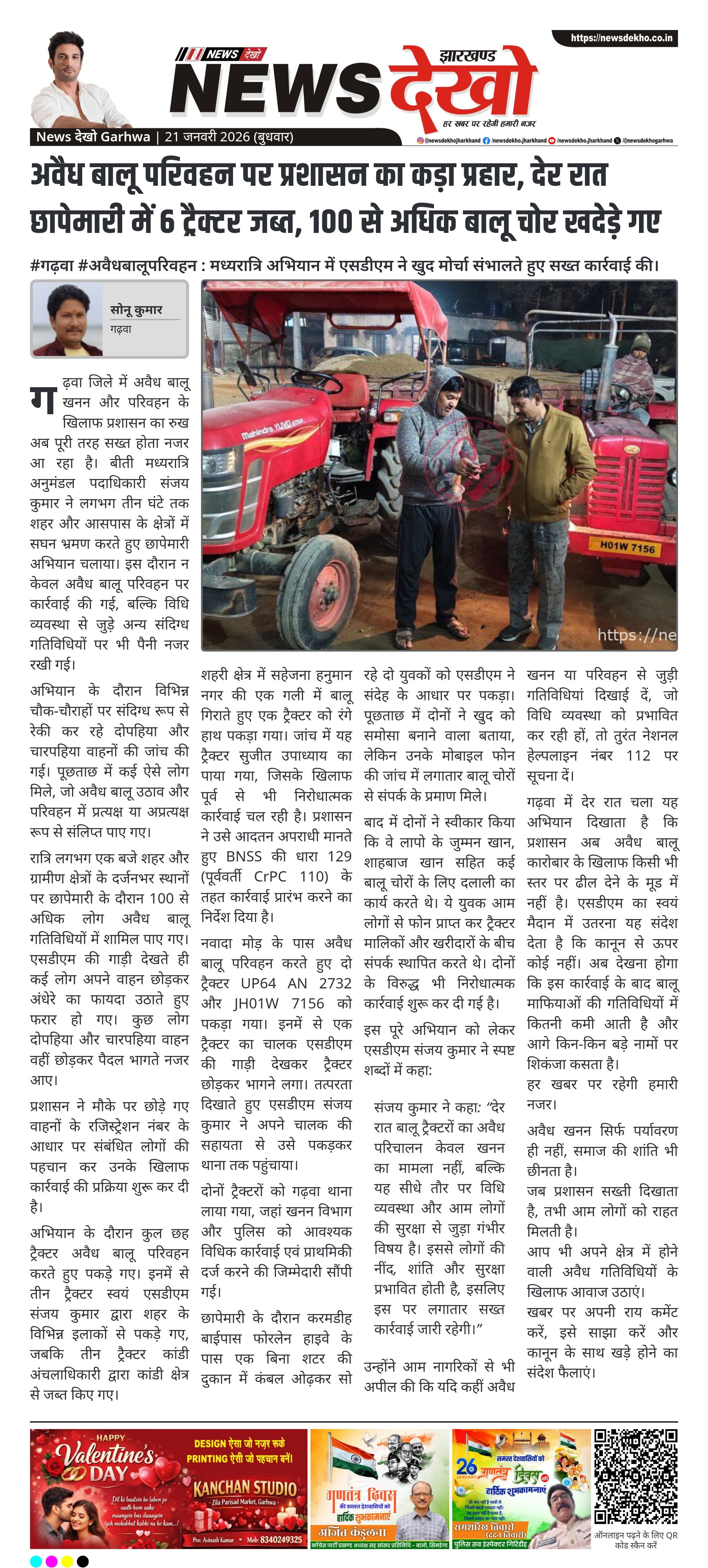 गढ़वा में अवैध बालू खनन और परिवहन के खिलाफ प्रशासन ने बड़ी कार्रवाई की है। अनुमंडल पदाधिकारी संजय कुमार ने देर रात स्वयं क्षेत्र में उतरकर छापेमारी अभियान चलाया, जिसमें छह ट्रैक्टर जब्त किए गए और सौ से अधिक बालू चोरों को खदेड़ा गया। इस दौरान दलाली में संलिप्त दो युवकों को भी पकड़ा गया। प्रशासन ने इसे विधि व्यवस्था से जुड़ा गंभीर मामला बताते हुए आगे भी सख्त कार्रवाई की चेतावनी दी है।