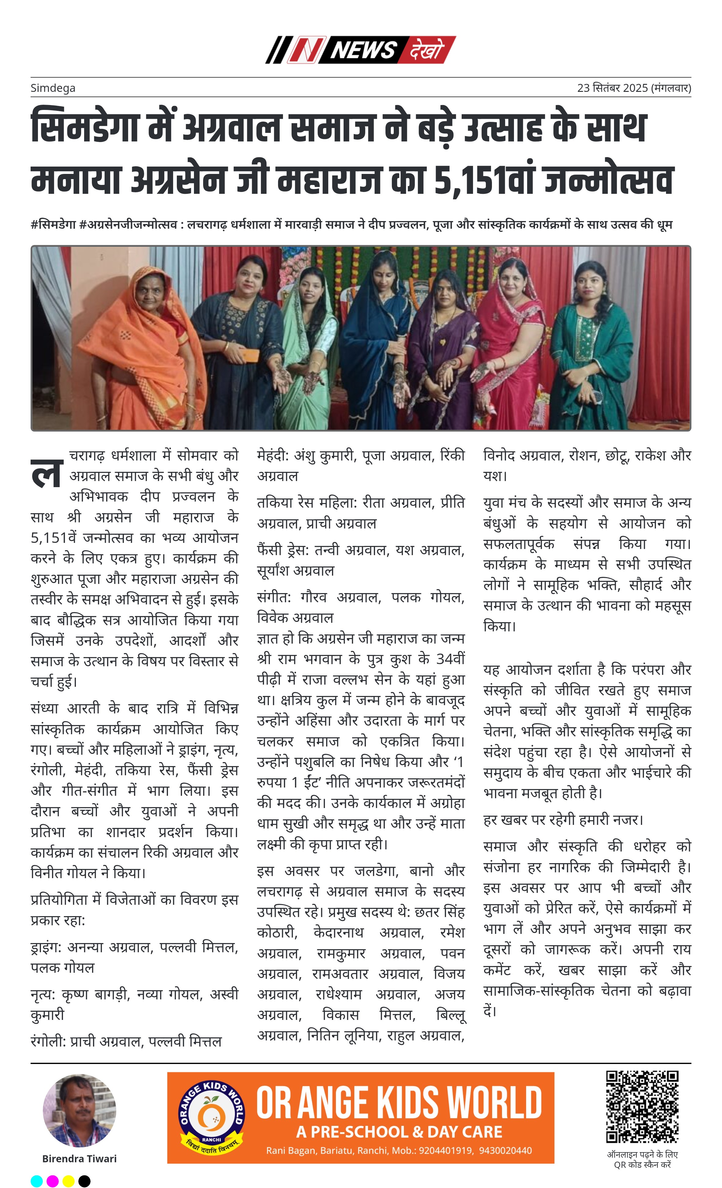 - 22 सितंबर, सोमवार को लचरागढ़ धर्मशाला में अग्रवाल समाज ने श्री अग्रसेन जी महाराज के 5,151वें जन्मोत्सव का भव्य आयोजन किया।