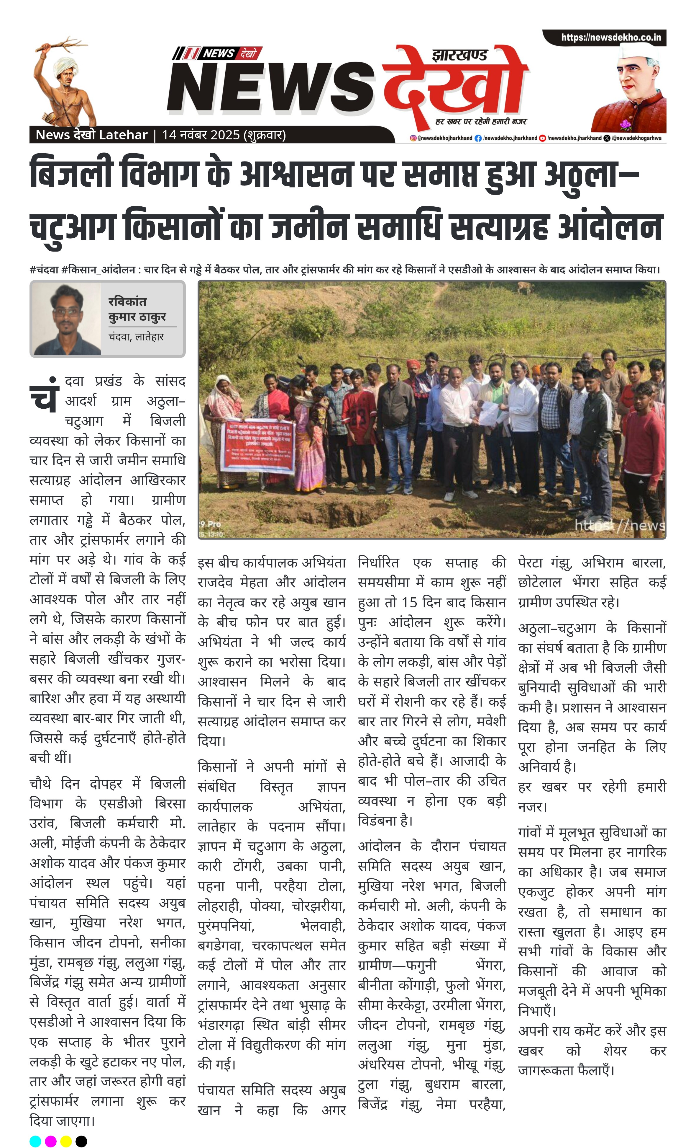 चंदवा प्रखंड के सांसद आदर्श ग्राम अठुला–चटुआग में बिजली व्यवस्था को लेकर किसानों का चार दिन से जारी जमीन समाधि सत्याग्रह आंदोलन आखिरकार समाप्त हो गया। ग्रामीण लगातार गड्ढे में बैठकर पोल, तार और ट्रांसफार्मर लगाने की मांग पर अड़े थे। गांव के कई टोलों में वर्षों से बिजली के लिए आवश्यक पोल और तार नहीं लगे थे, जिसके कारण किसानों ने बांस और लकड़ी के खंभों के सहारे बिजली खींचकर गुजर-बसर की व्यवस्था बना रखी थी। बारिश और हवा में यह अस्थायी व्यवस्था बार-बार गिर जाती थी, जिससे कई दुर्घटनाएँ होते-होते बची थीं।