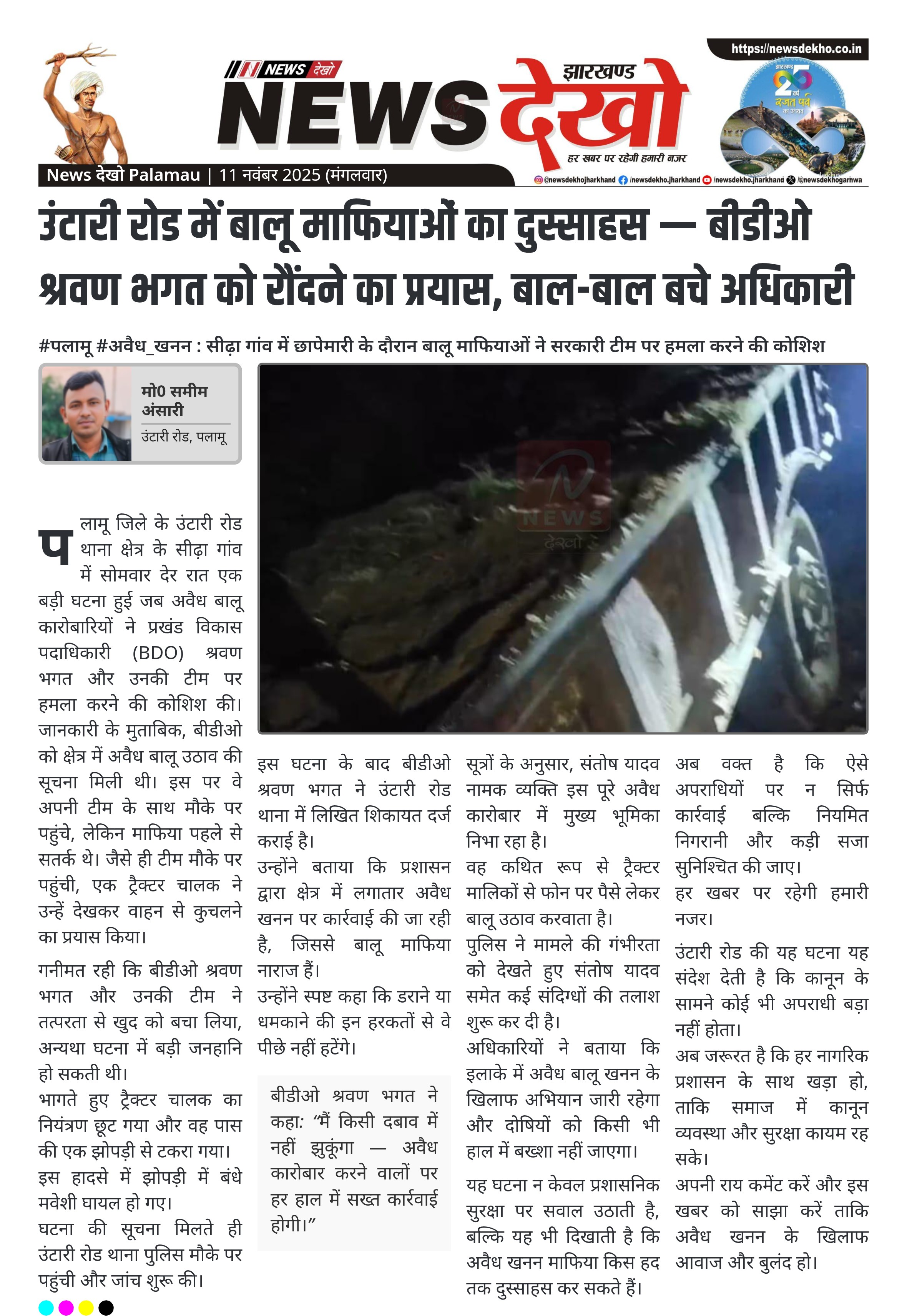 पलामू जिले के उंटारी रोड थाना क्षेत्र के सीढ़ा गांव में सोमवार देर रात एक बड़ी घटना हुई जब अवैध बालू कारोबारियों ने प्रखंड विकास पदाधिकारी (BDO) श्रवण भगत और उनकी टीम पर हमला करने की कोशिश की।