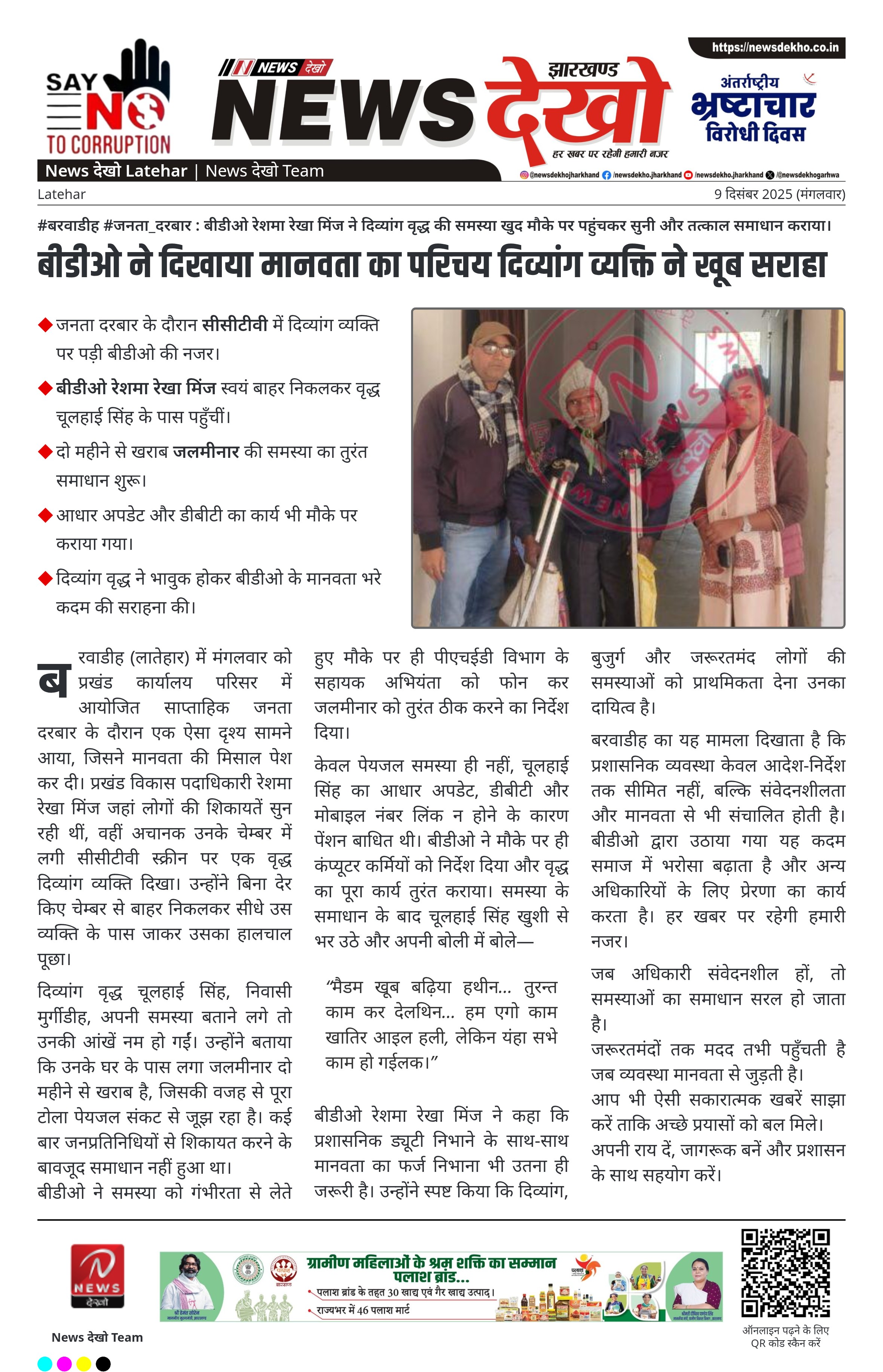 बरवाडीह (लातेहार) में मंगलवार को प्रखंड कार्यालय परिसर में आयोजित साप्ताहिक जनता दरबार के दौरान एक ऐसा दृश्य सामने आया, जिसने मानवता की मिसाल पेश कर दी। प्रखंड विकास पदाधिकारी रेशमा रेखा मिंज जहां लोगों की शिकायतें सुन रही थीं, वहीं अचानक उनके चेम्बर में लगी सीसीटीवी स्क्रीन पर एक वृद्ध दिव्यांग व्यक्ति दिखा। उन्होंने बिना देर किए चेम्बर से बाहर निकलकर सीधे उस व्यक्ति के पास जाकर उसका हालचाल पूछा।