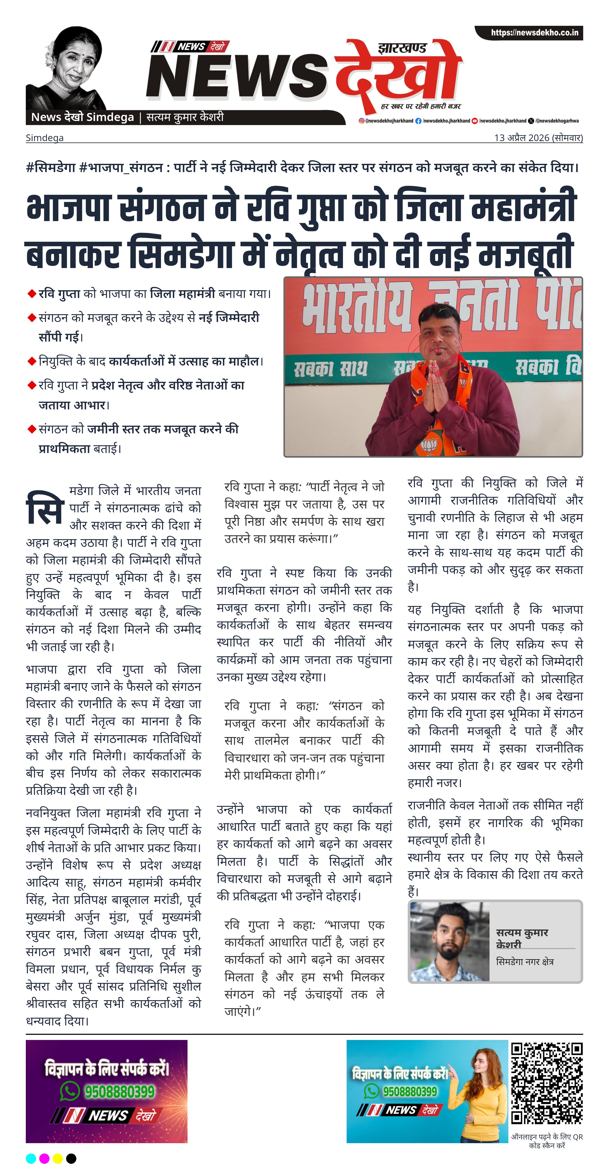 - रवि गुप्ता को भाजपा का जिला महामंत्री बनाया गया।