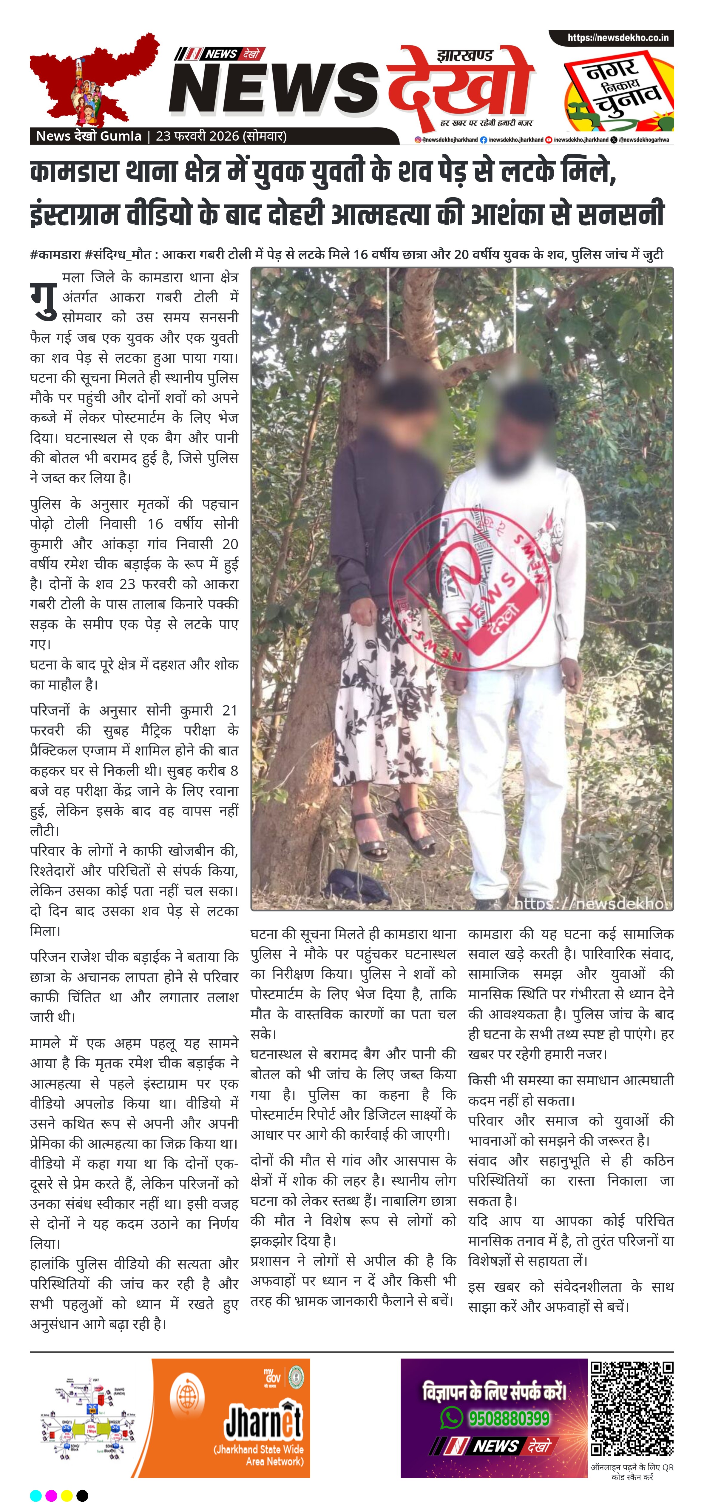 #कामडारा #संदिग्ध_मौत : आकरा गबरी टोली में पेड़ से लटके मिले 16 वर्षीय छात्रा और 20 वर्षीय युवक के शव, पुलिस जांच में जुटी
