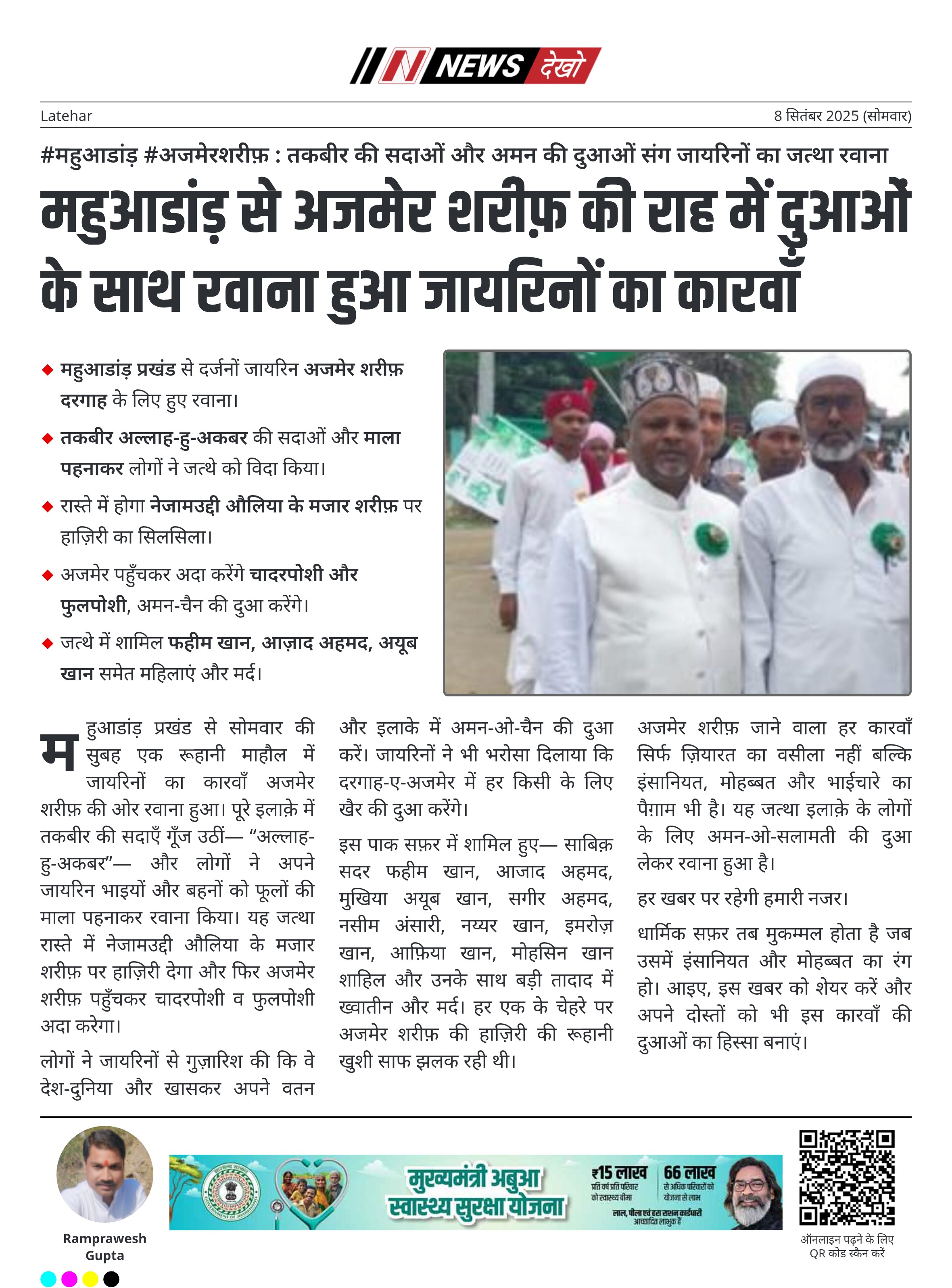 महुआडांड़ प्रखंड से सोमवार की सुबह एक रूहानी माहौल में जायरिनों का कारवाँ अजमेर शरीफ़ की ओर रवाना हुआ। पूरे इलाक़े में तकबीर की सदाएँ गूँज उठीं— “अल्लाह-हु-अकबर”— और लोगों ने अपने जायरिन भाइयों और बहनों को फूलों की माला पहनाकर रवाना किया। यह जत्था रास्ते में नेजामउद्दी औलिया के मजार शरीफ़ पर हाज़िरी देगा और फिर अजमेर शरीफ़ पहुँचकर चादरपोशी व फुलपोशी अदा करेगा।