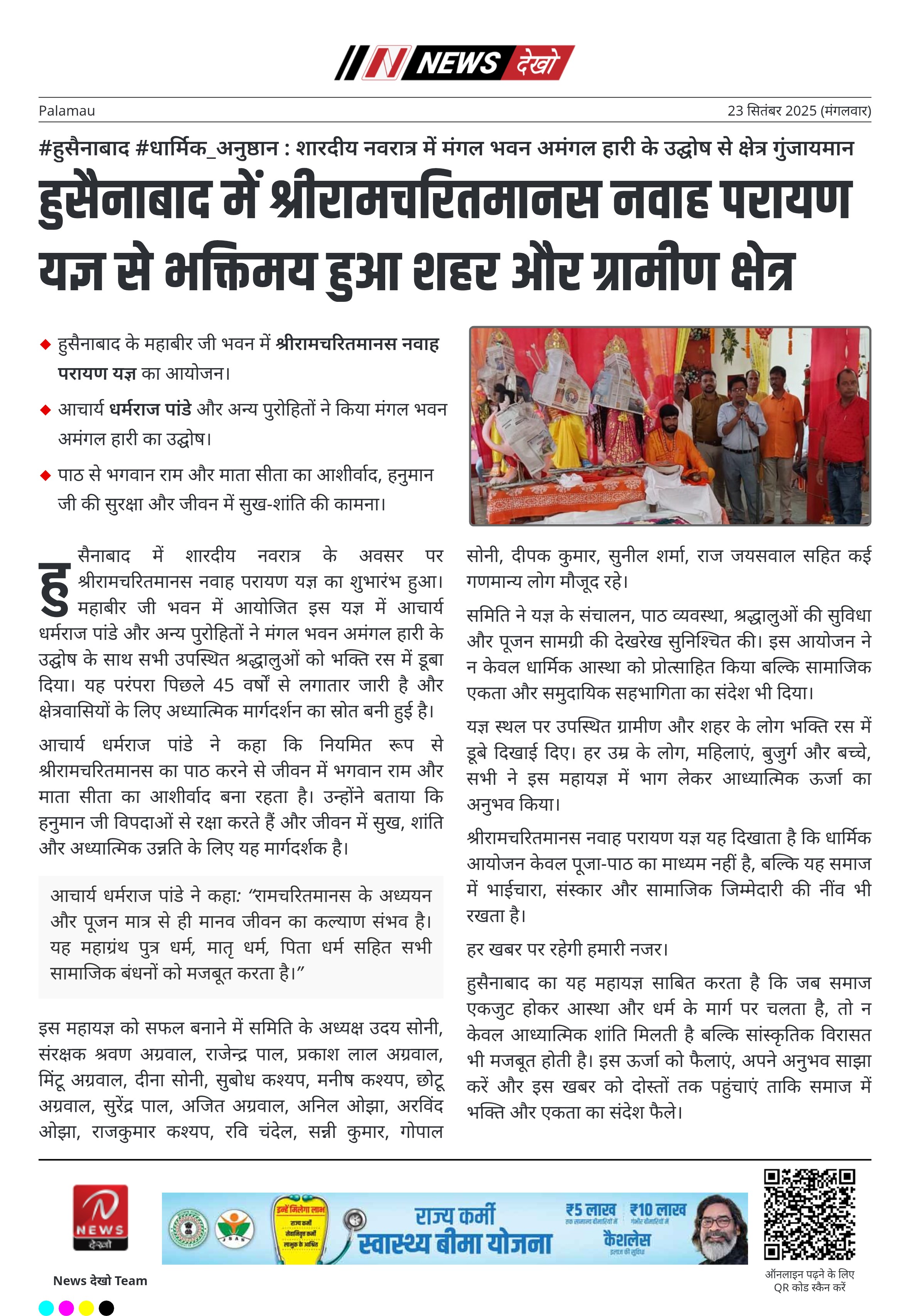 हुसैनाबाद में शारदीय नवरात्र के अवसर पर श्रीरामचरितमानस नवाह परायण यज्ञ का शुभारंभ हुआ। महाबीर जी भवन में आयोजित इस यज्ञ में आचार्य धर्मराज पांडे और अन्य पुरोहितों ने मंगल भवन अमंगल हारी के उद्घोष के साथ सभी उपस्थित श्रद्धालुओं को भक्ति रस में डूबा दिया। यह परंपरा पिछले 45 वर्षों से लगातार जारी है और क्षेत्रवासियों के लिए अध्यात्मिक मार्गदर्शन का स्रोत बनी हुई है।
