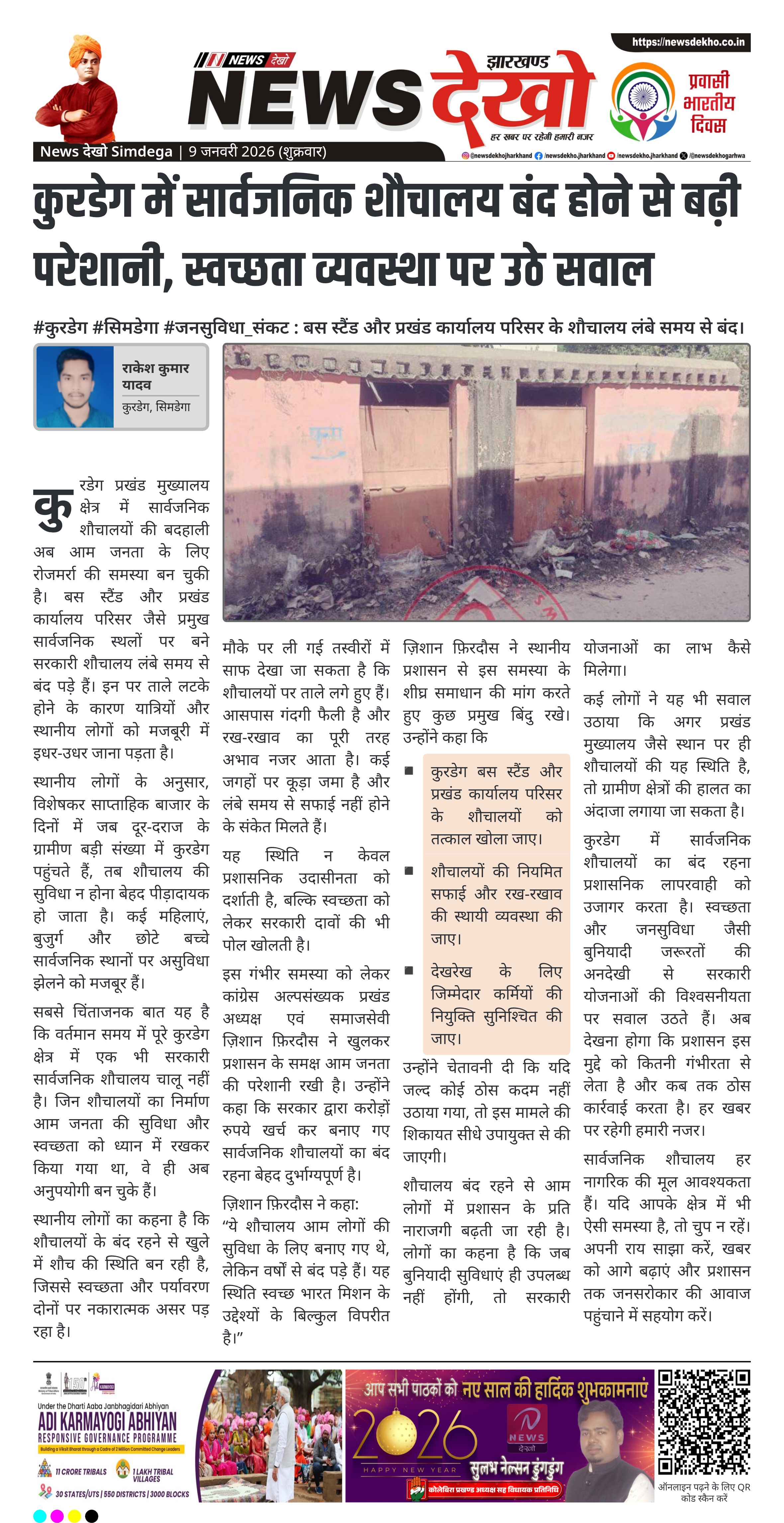 सिमडेगा जिले के कुरडेग प्रखंड में सार्वजनिक शौचालयों के बंद रहने से आम लोगों को गंभीर परेशानियों का सामना करना पड़ रहा है। बस स्टैंड और प्रखंड कार्यालय परिसर में बने सरकारी शौचालय लंबे समय से ताले में बंद हैं, जिससे यात्रियों, महिलाओं और बुजुर्गों को भारी दिक्कत हो रही है। कांग्रेस अल्पसंख्यक प्रखंड अध्यक्ष ने इसे जनसुविधा से जुड़ा गंभीर मुद्दा बताते हुए प्रशासन से त्वरित कार्रवाई की मांग की है। यह स्थिति स्वच्छता व्यवस्था और सरकारी योजनाओं की जमीनी हकीकत पर सवाल खड़े करती है।