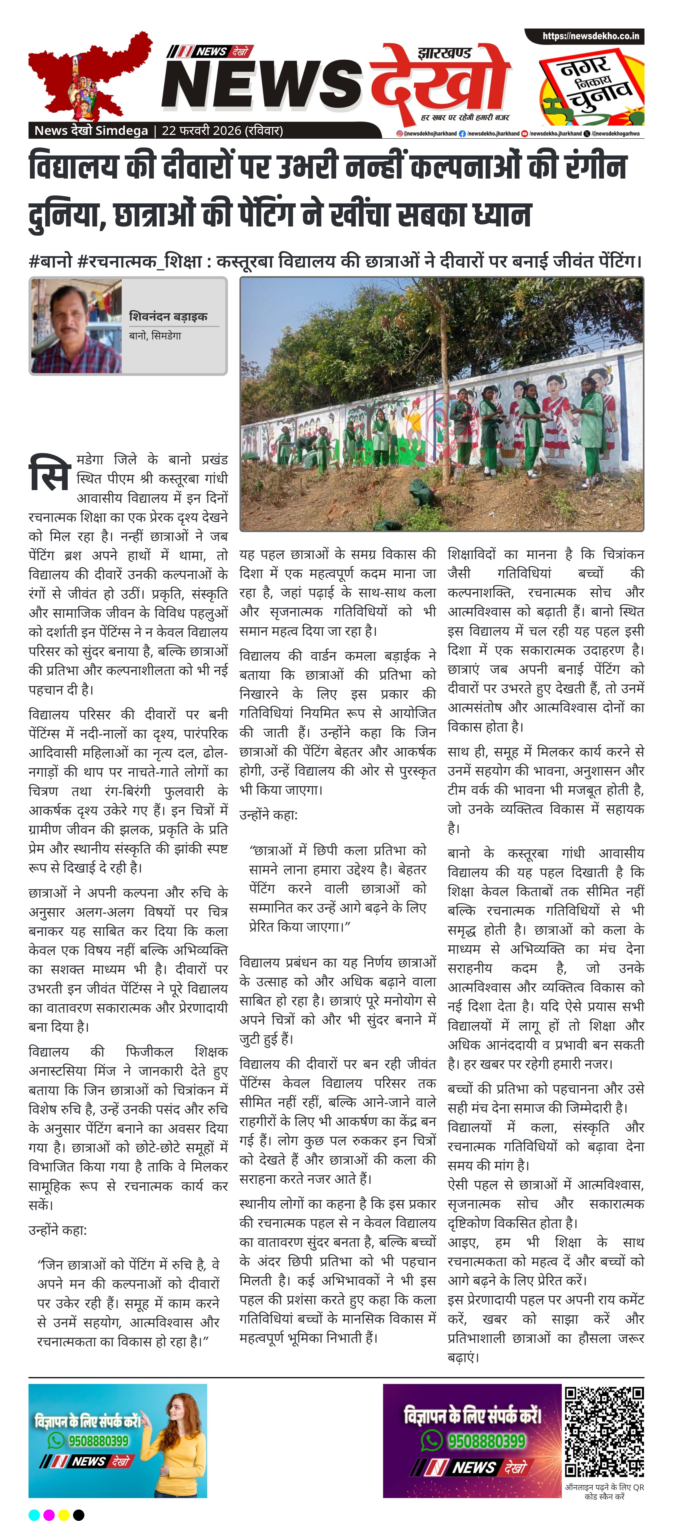 सिमडेगा जिले के बानो प्रखंड स्थित पीएम श्री कस्तूरबा गांधी आवासीय विद्यालय में इन दिनों रचनात्मक शिक्षा का एक प्रेरक दृश्य देखने को मिल रहा है। नन्हीं छात्राओं ने जब पेंटिंग ब्रश अपने हाथों में थामा, तो विद्यालय की दीवारें उनकी कल्पनाओं के रंगों से जीवंत हो उठीं। प्रकृति, संस्कृति और सामाजिक जीवन के विविध पहलुओं को दर्शाती इन पेंटिंग्स ने न केवल विद्यालय परिसर को सुंदर बनाया है, बल्कि छात्राओं की प्रतिभा और कल्पनाशीलता को भी नई पहचान दी है।