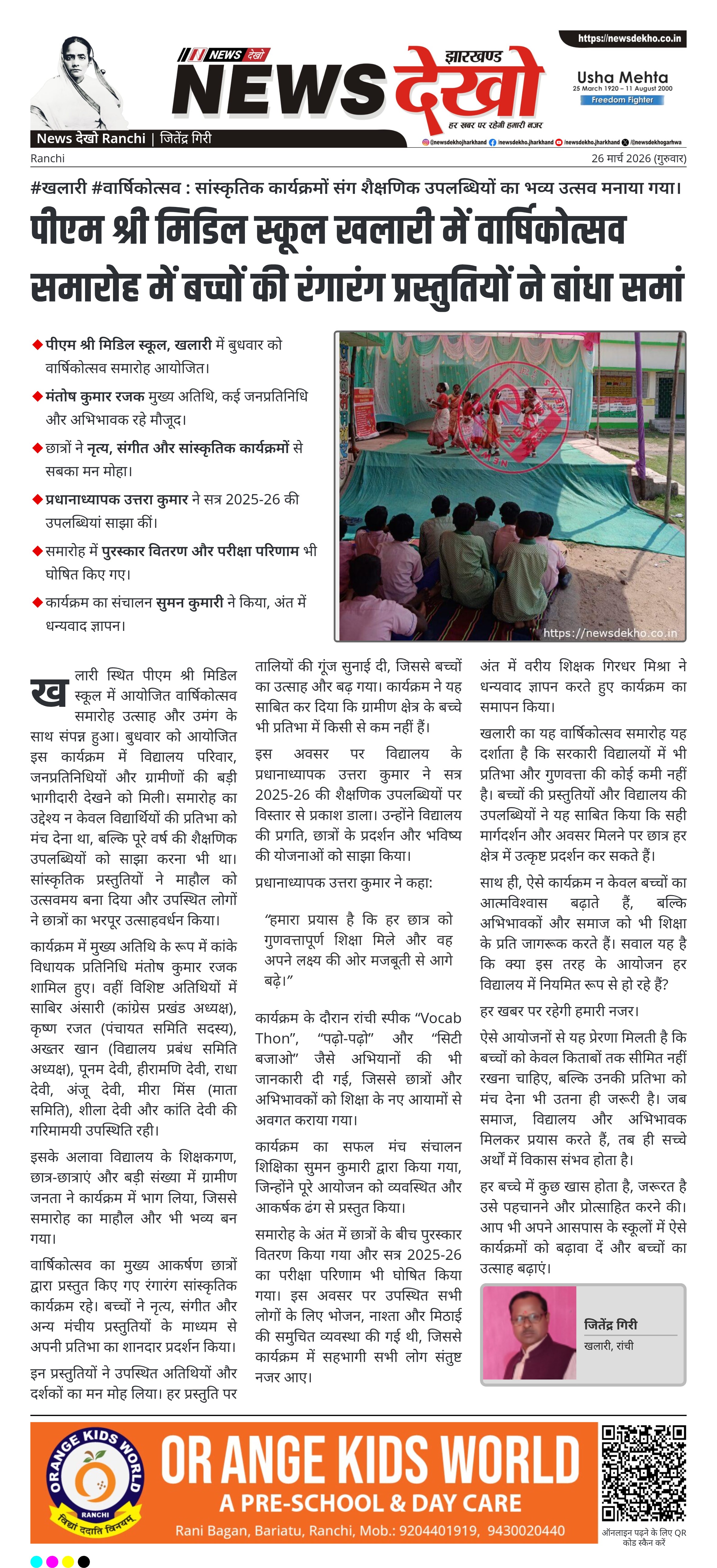 - पीएम श्री मिडिल स्कूल, खलारी में बुधवार को वार्षिकोत्सव समारोह आयोजित।