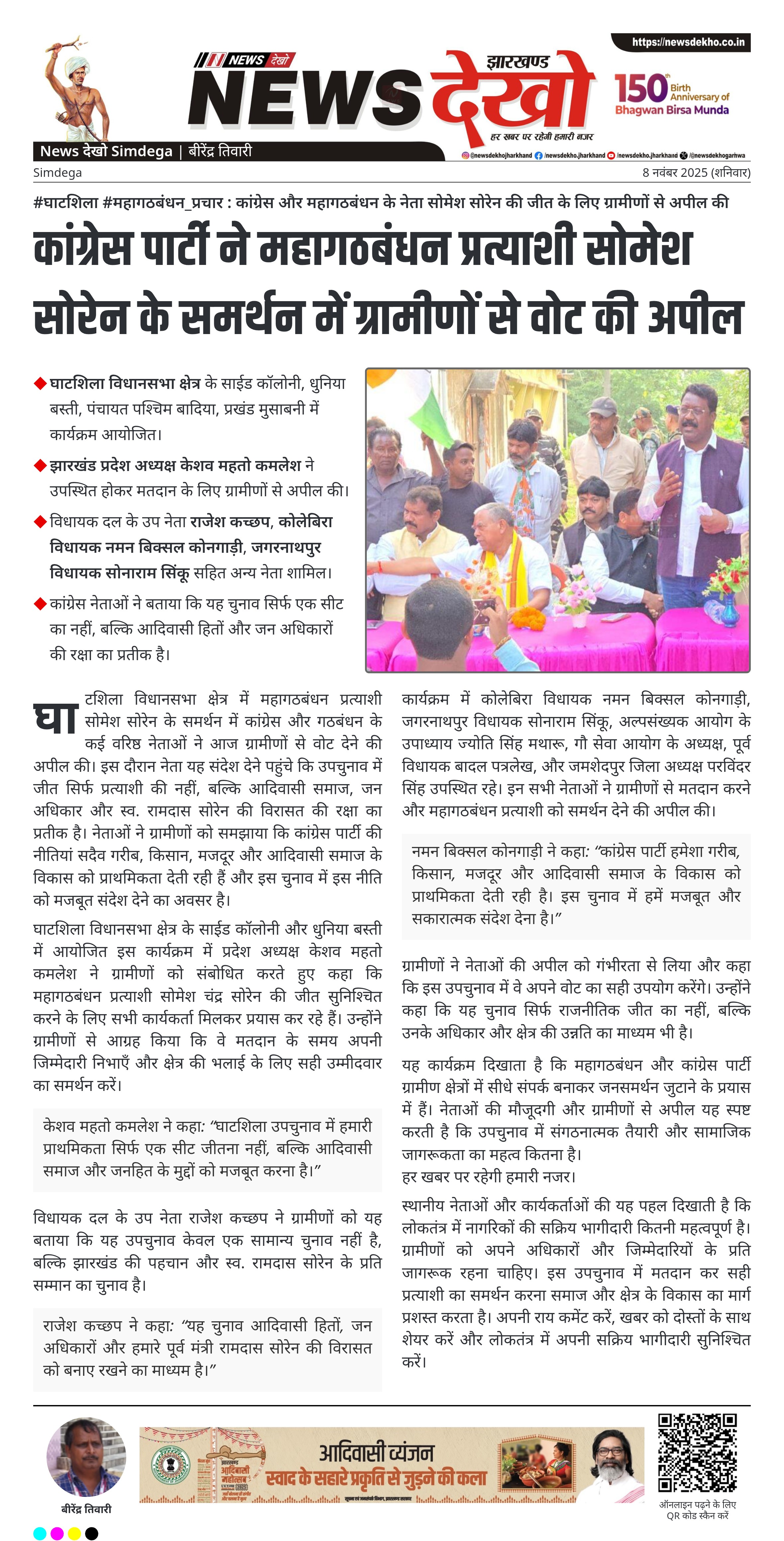 नमन बिक्सल कोनगाड़ी ने कहा: “कांग्रेस पार्टी हमेशा गरीब, किसान, मजदूर और आदिवासी समाज के विकास को प्राथमिकता देती रही है। इस चुनाव में हमें मजबूत और सकारात्मक संदेश देना है।”