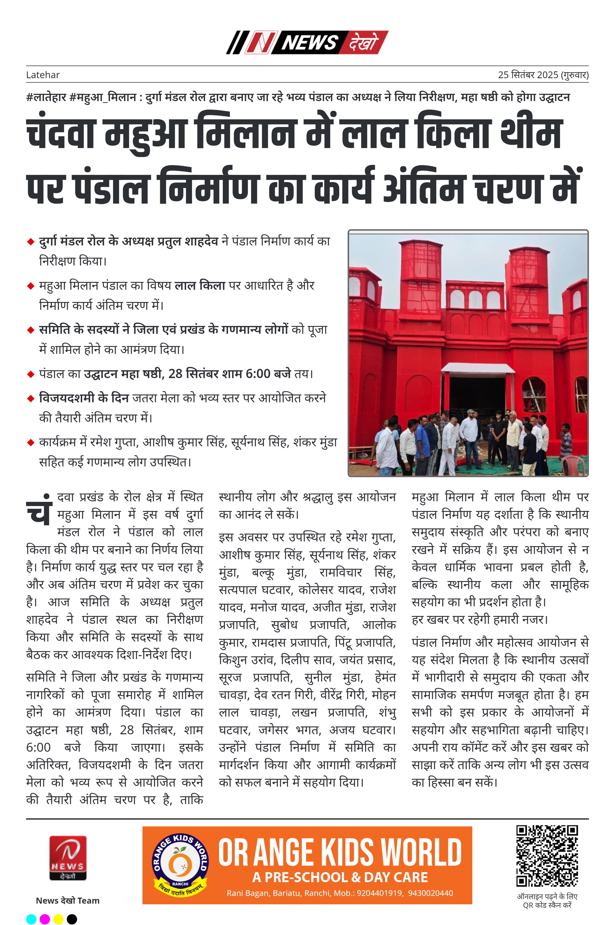 महुआ मिलान में लाल किला थीम पर पंडाल निर्माण यह दर्शाता है कि स्थानीय समुदाय संस्कृति और परंपरा को बनाए रखने में सक्रिय हैं। इस आयोजन से न केवल धार्मिक भावना प्रबल होती है, बल्कि स्थानीय कला और सामूहिक सहयोग का भी प्रदर्शन होता है।