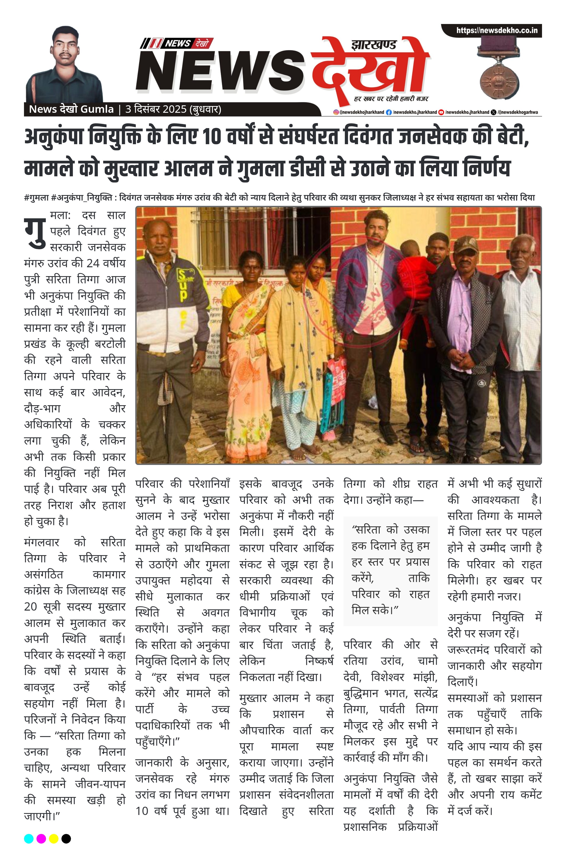 जानकारी के अनुसार, जनसेवक रहे मंगरु उरांव का निधन लगभग 10 वर्ष पूर्व हुआ था। इसके बावजूद उनके परिवार को अभी तक अनुकंपा में नौकरी नहीं मिली। इसमें देरी के कारण परिवार आर्थिक संकट से जूझ रहा है। सरकारी व्यवस्था की धीमी प्रक्रियाओं एवं विभागीय चूक को लेकर परिवार ने कई बार चिंता जताई है, लेकिन निष्कर्ष निकलता नहीं दिखा।