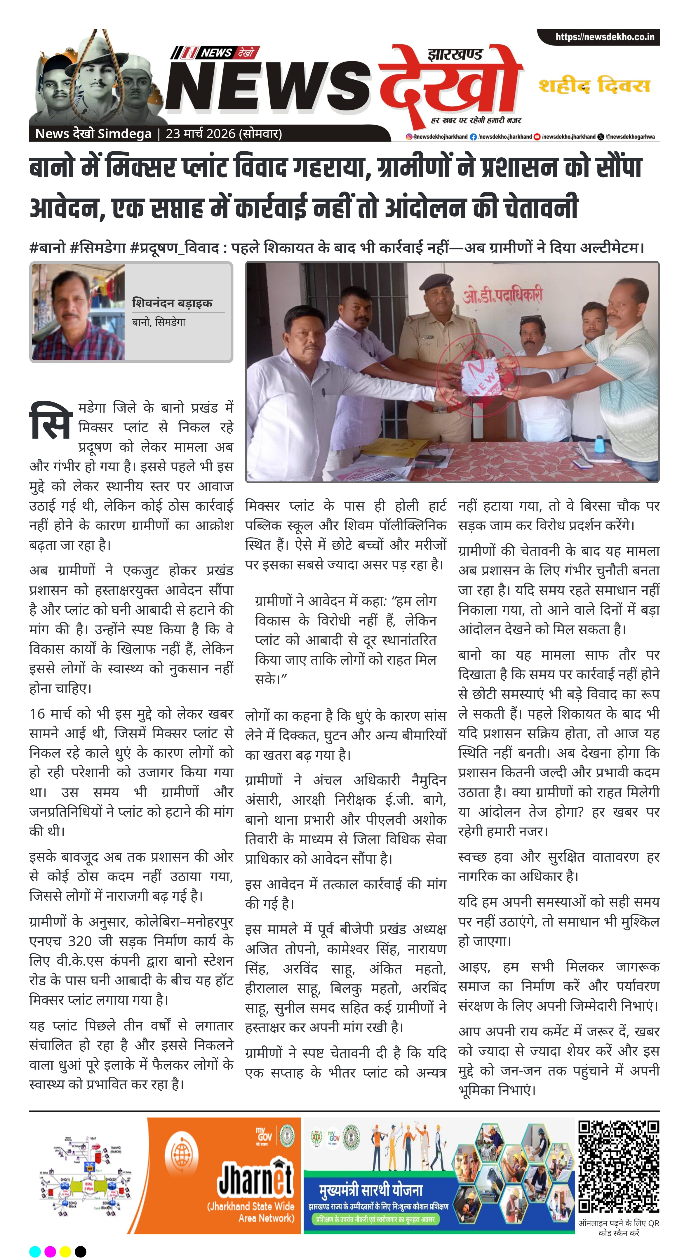 सिमडेगा जिले के बानो प्रखंड में मिक्सर प्लांट से निकल रहे जहरीले धुएं को लेकर विवाद बढ़ता जा रहा है। पहले शिकायत के बावजूद कार्रवाई नहीं होने पर ग्रामीणों ने अब प्रशासन को हस्ताक्षरयुक्त आवेदन सौंपा है। लोगों का कहना है कि प्लांट से स्वास्थ्य पर गंभीर असर पड़ रहा है। चेतावनी दी गई है कि एक सप्ताह में समाधान नहीं हुआ तो सड़क जाम किया जाएगा।