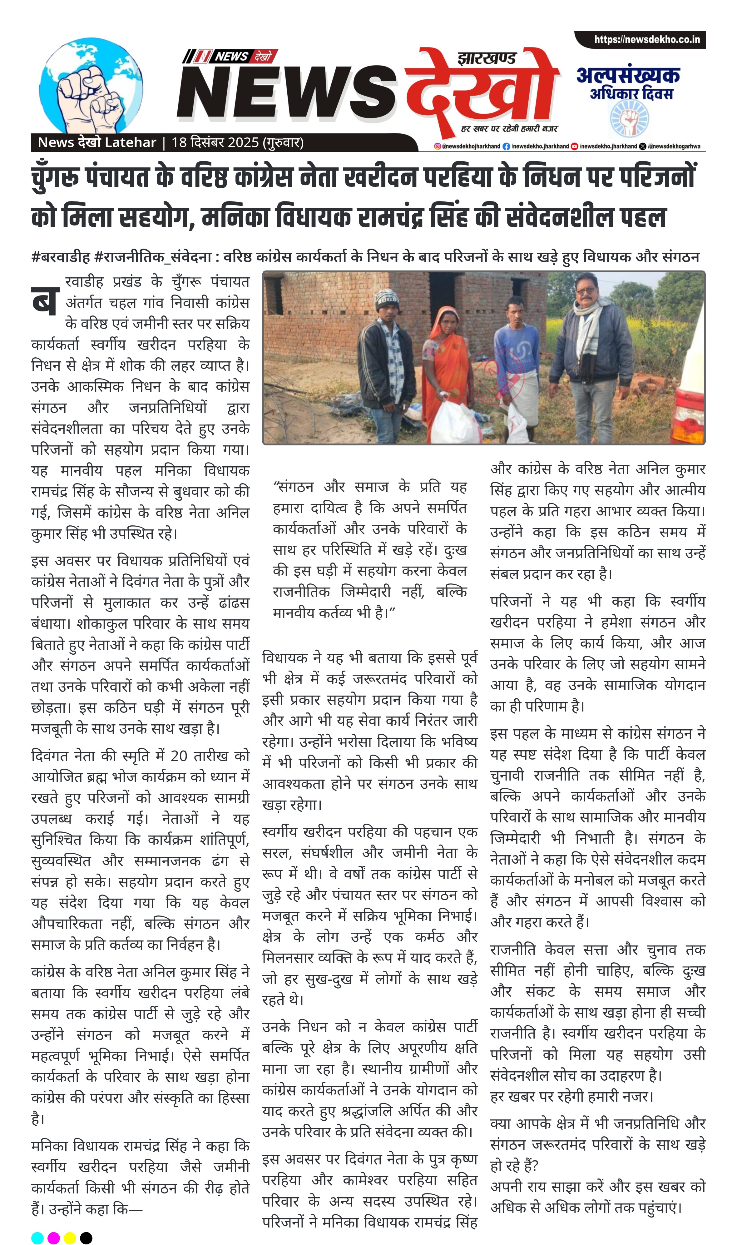 बरवाडीह प्रखंड के चुँगरू पंचायत अंतर्गत चहल गांव निवासी कांग्रेस के वरिष्ठ एवं जमीनी स्तर पर सक्रिय कार्यकर्ता स्वर्गीय खरीदन परहिया के निधन से क्षेत्र में शोक की लहर व्याप्त है। उनके आकस्मिक निधन के बाद कांग्रेस संगठन और जनप्रतिनिधियों द्वारा संवेदनशीलता का परिचय देते हुए उनके परिजनों को सहयोग प्रदान किया गया। यह मानवीय पहल मनिका विधायक रामचंद्र सिंह के सौजन्य से बुधवार को की गई, जिसमें कांग्रेस के वरिष्ठ नेता अनिल कुमार सिंह भी उपस्थित रहे।