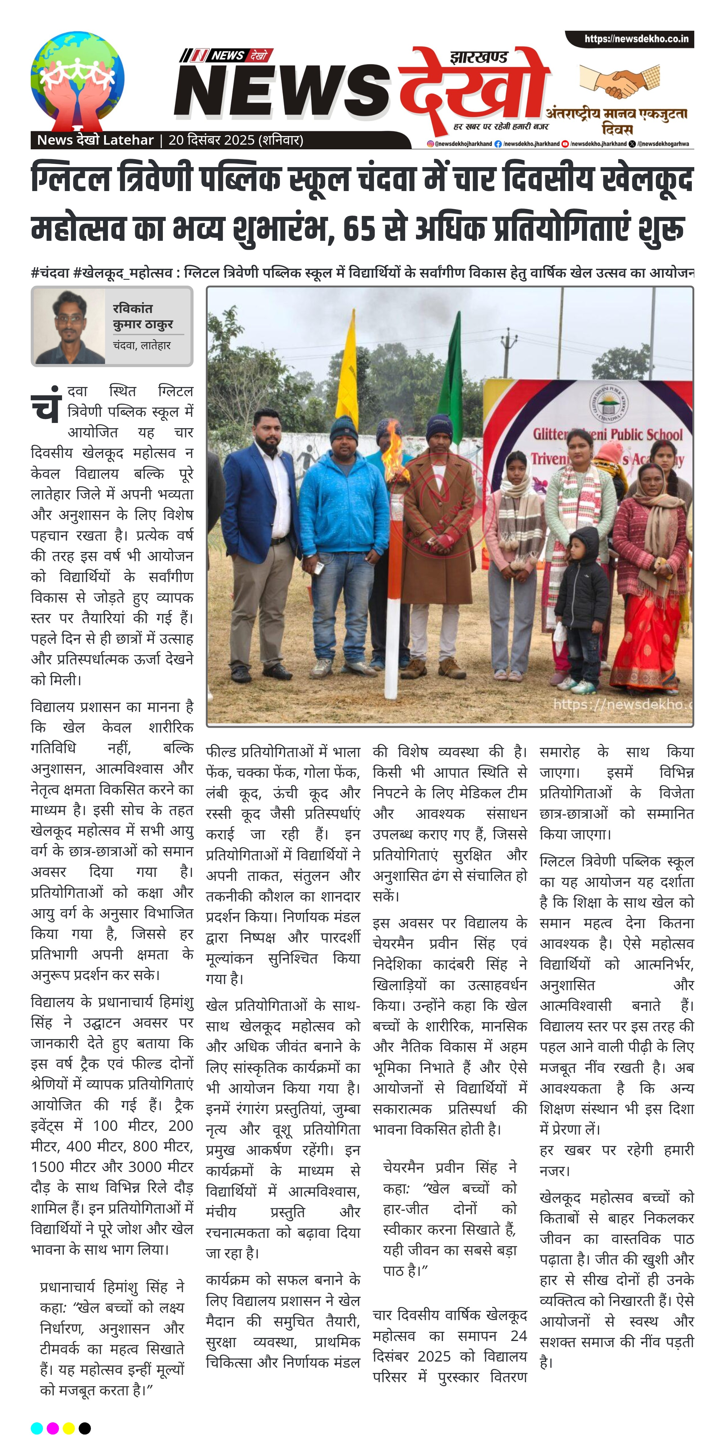 लातेहार जिले के चंदवा स्थित ग्लिटल त्रिवेणी पब्लिक स्कूल में शनिवार 20 दिसंबर 2025 को चार दिवसीय वार्षिक खेलकूद महोत्सव का भव्य शुभारंभ हुआ। इस आयोजन में विद्यालय के विभिन्न वर्गों के छात्र-छात्राएं 65 से अधिक खेल प्रतियोगिताओं में भाग ले रहे हैं। खेल महोत्सव का उद्देश्य विद्यार्थियों में शारीरिक दक्षता, अनुशासन और खेल भावना का विकास करना है। कार्यक्रम का समापन 24 दिसंबर 2025 को पुरस्कार वितरण समारोह के साथ किया जाएगा।