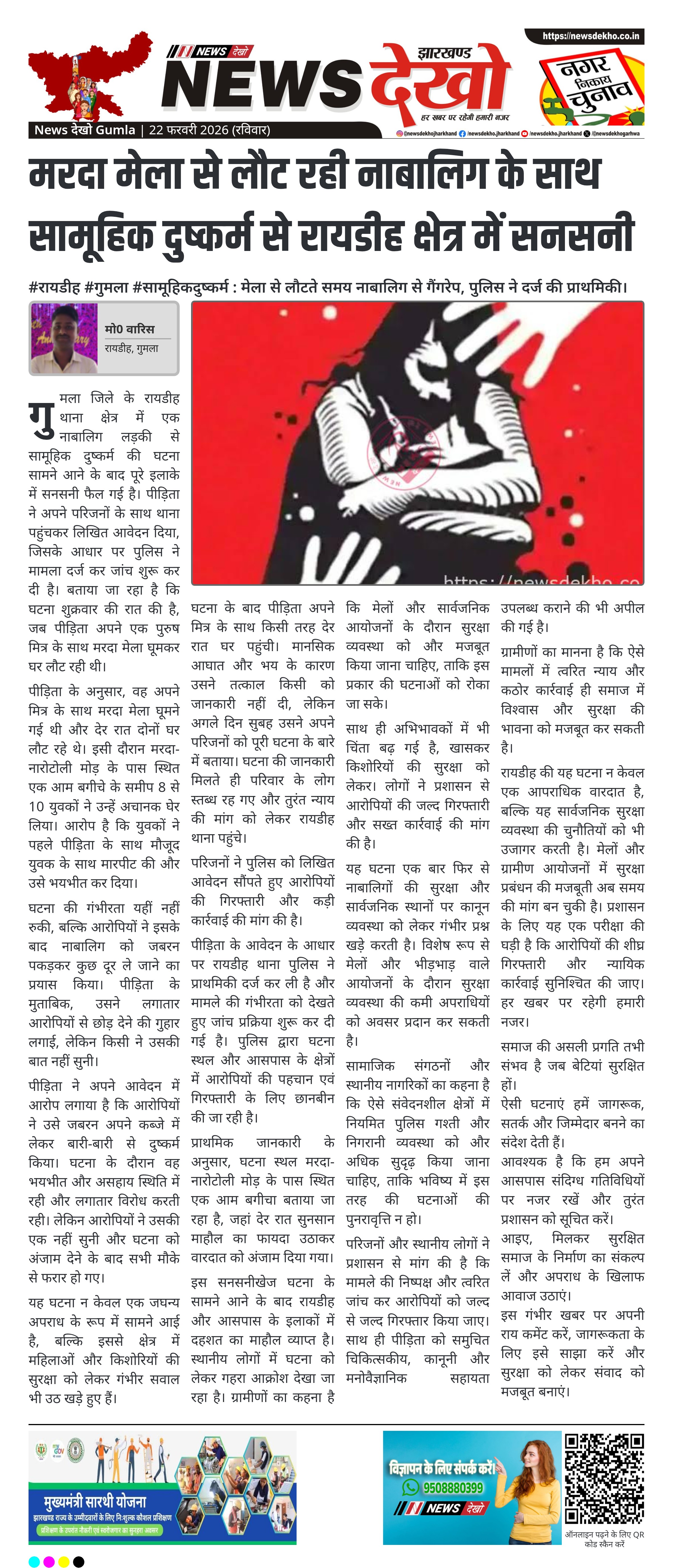 - रायडीह थाना क्षेत्र में 16 वर्षीय नाबालिग से सामूहिक दुष्कर्म का आरोप।