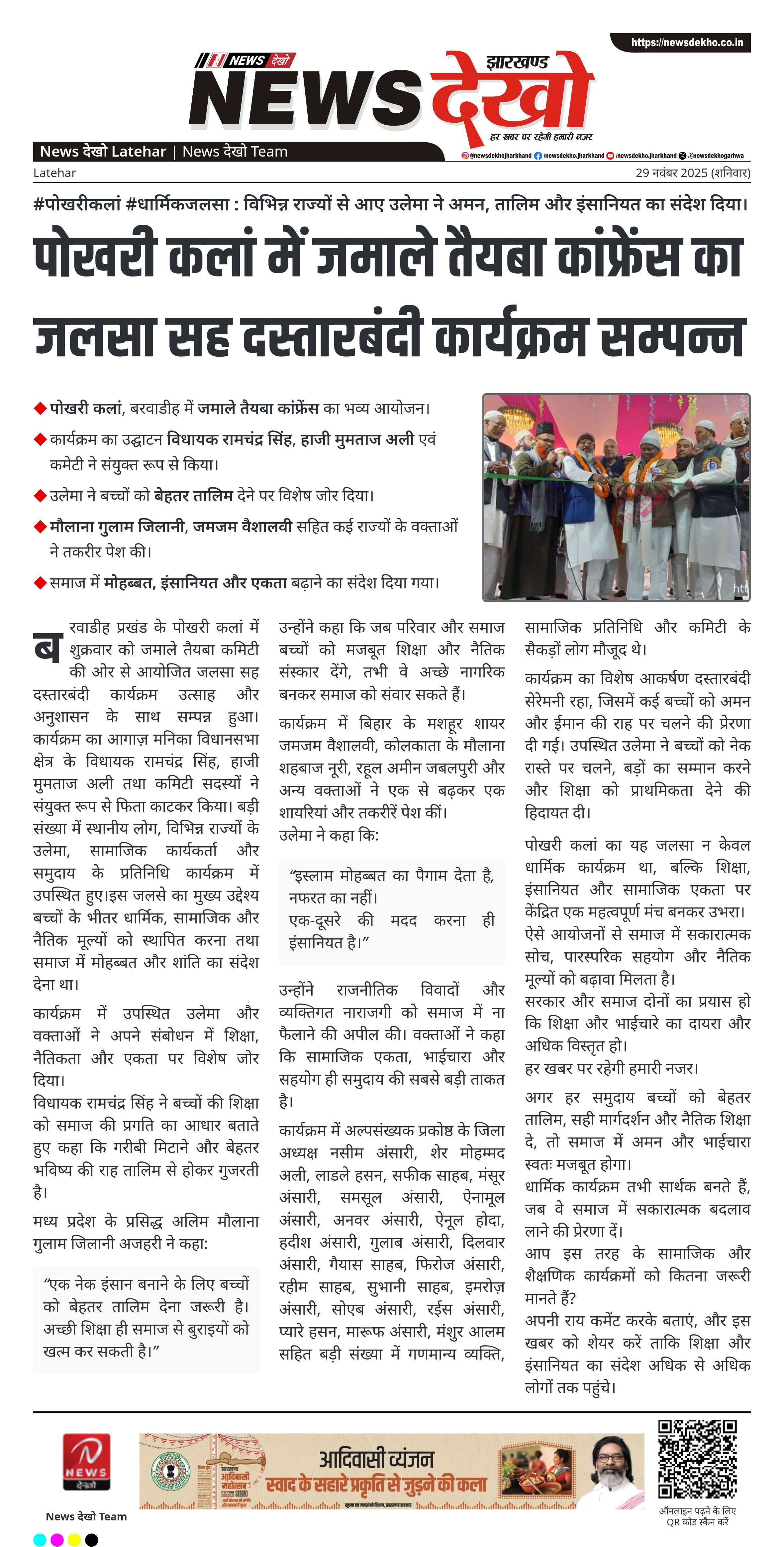बरवाडीह प्रखंड के पोखरी कलां में शुक्रवार को जमाले तैयबा कमिटी की ओर से आयोजित जलसा सह दस्तारबंदी कार्यक्रम उत्साह और अनुशासन के साथ सम्पन्न हुआ। कार्यक्रम का आगाज़ मनिका विधानसभा क्षेत्र के विधायक रामचंद्र सिंह, हाजी मुमताज अली तथा कमिटी सदस्यों ने संयुक्त रूप से फिता काटकर किया। बड़ी संख्या में स्थानीय लोग, विभिन्न राज्यों के उलेमा, सामाजिक कार्यकर्ता और समुदाय के प्रतिनिधि कार्यक्रम में उपस्थित हुए।