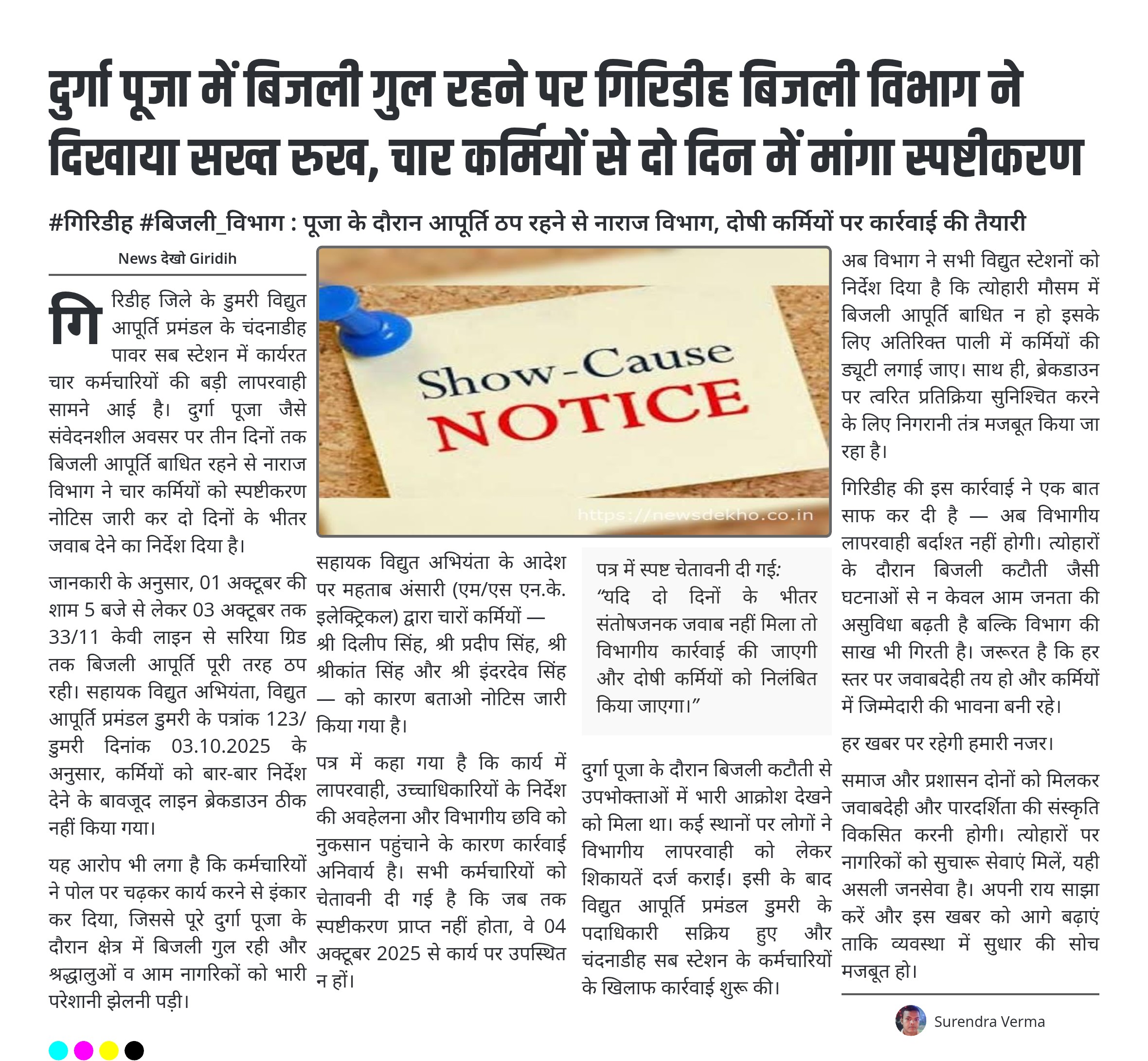 - चंदनाडीह सब स्टेशन के चार कर्मचारियों से दो दिनों के भीतर स्पष्टीकरण मांगा गया।