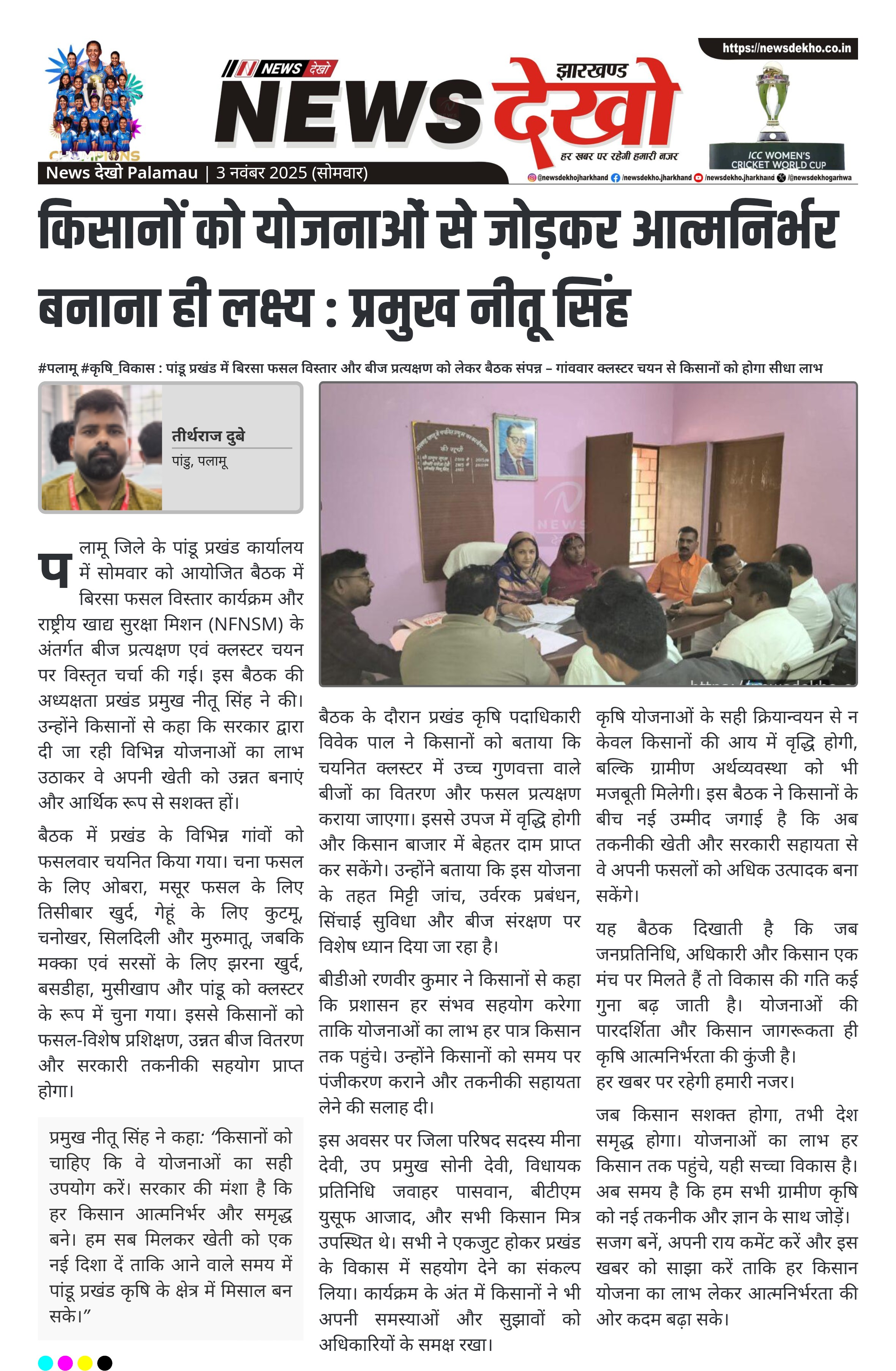 - बैठक की अध्यक्षता प्रमुख नीतू सिंह ने की और किसानों को सरकारी योजनाओं से जुड़ने का आह्वान किया।