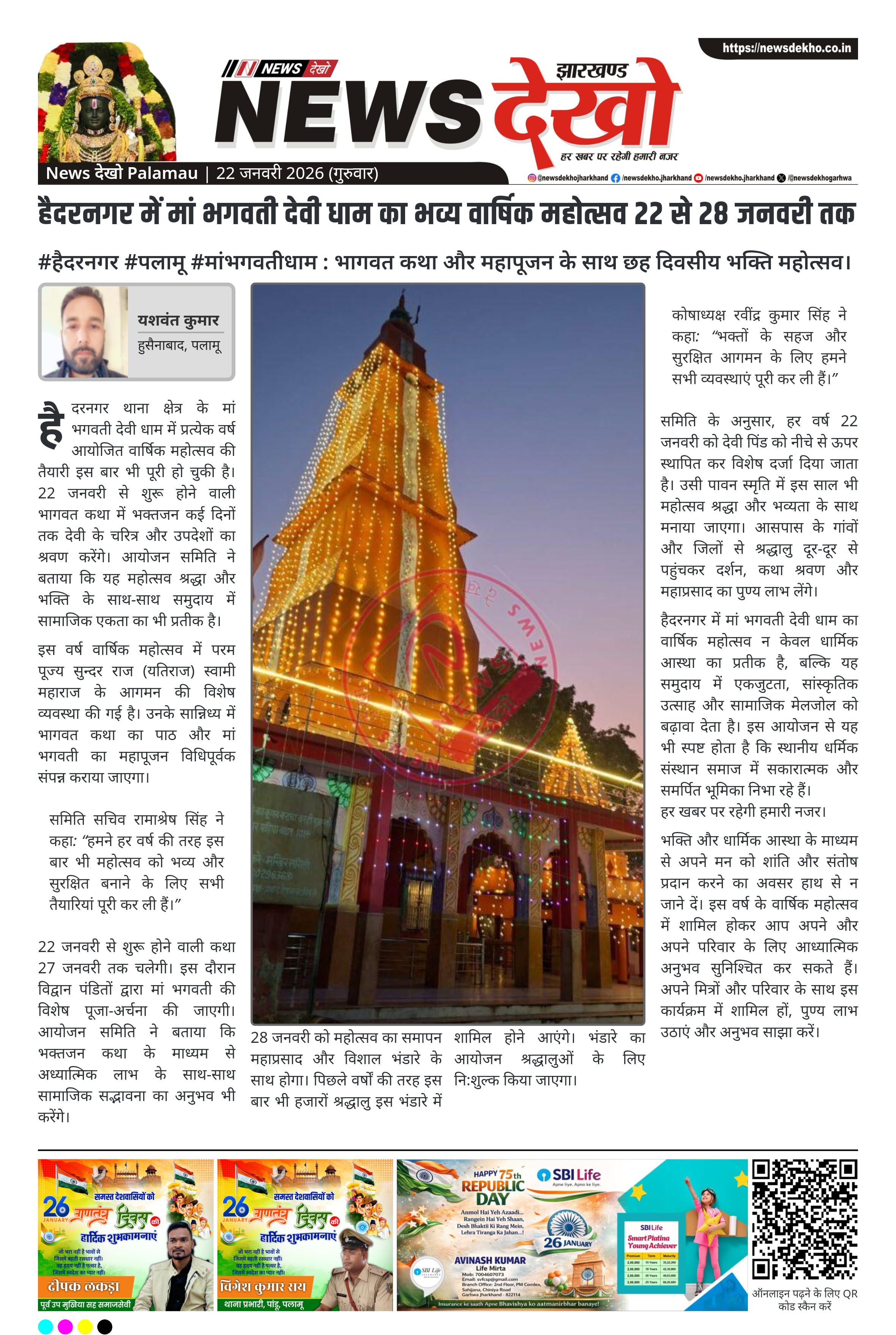 पलामू जिले के हैदरनगर थाना क्षेत्र में मां भगवती देवी धाम में 22 से 28 जनवरी 2026 तक भव्य वार्षिक महोत्सव आयोजित किया जा रहा है। आयोजन में भागवत कथा, विशेष पूजा-अर्चना और महाप्रसाद वितरण शामिल हैं। परम पूज्य सुन्दर राज स्वामी महाराज के सान्निध्य में कार्यक्रम संपन्न होगा। श्रद्धालु दूर-दूर से दर्शन और भक्ति में शामिल होने पहुंचेंगे।